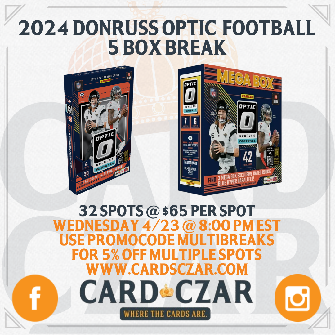 2024 Donruss Optic Football 5 Box Break We will be getting in BOTH Retail and Hobby SKUs of 2024 Donruss Optic Football for your ripping pleasure this week, so we should probably have a Hobby release day break, right? Right! We will be pairing 3 Mega Boxes with 2 Hobby Boxes as we go Downtown... View Article