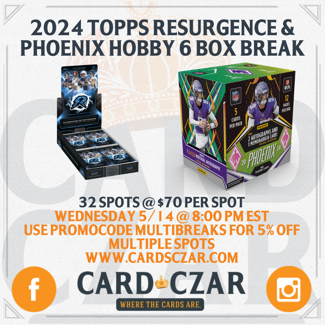 2024 Topps Resurgence & Phoenix Football 6 Hobby Box Break We are going to dabble by crossing streams again this week with Topps AND Panini products in this week's break! Tons of color, autos, patches and parallels in this break from ALL the top rookies in the 2024 class! This break will be: 2024 Topps... View Article