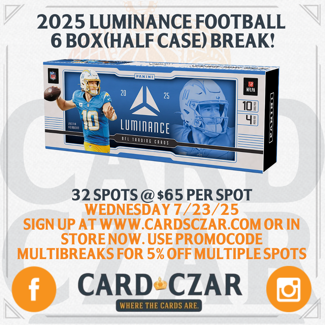 2025 Luminance Football 6 Hobby Box (Half Case) Break The first break of the 2025 NFL season is here, and of course, it is on RELEASE DAY! Chase autos, chunky patches, #'d parallels and CASE HITS all night Wednesday night at CARD CZAR! This break will be: 2025 Luminance Football x 6 What's in the... View Article