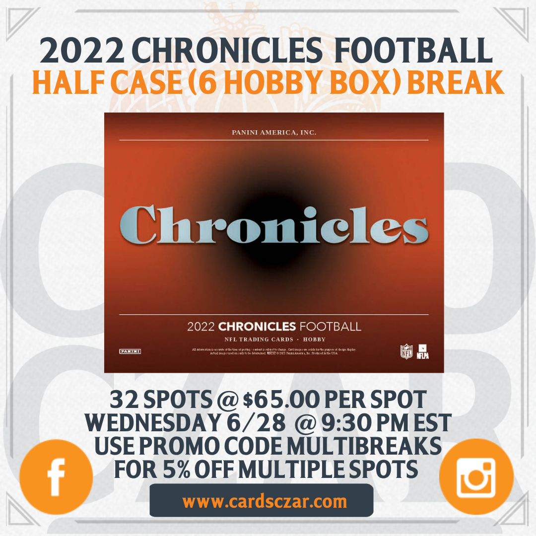 2022 Panini Chronicles Football Hobby 6 Hobby Box (Half Case) Break One of the first Card Czar favorites after we absolutely CRUSHED the 2020 release of this set, we are back with a HALF CASE break AFTER our trade night Wednesday night! This break will be: 2022 Chronicles Football x 6 What's in the break?... View Article