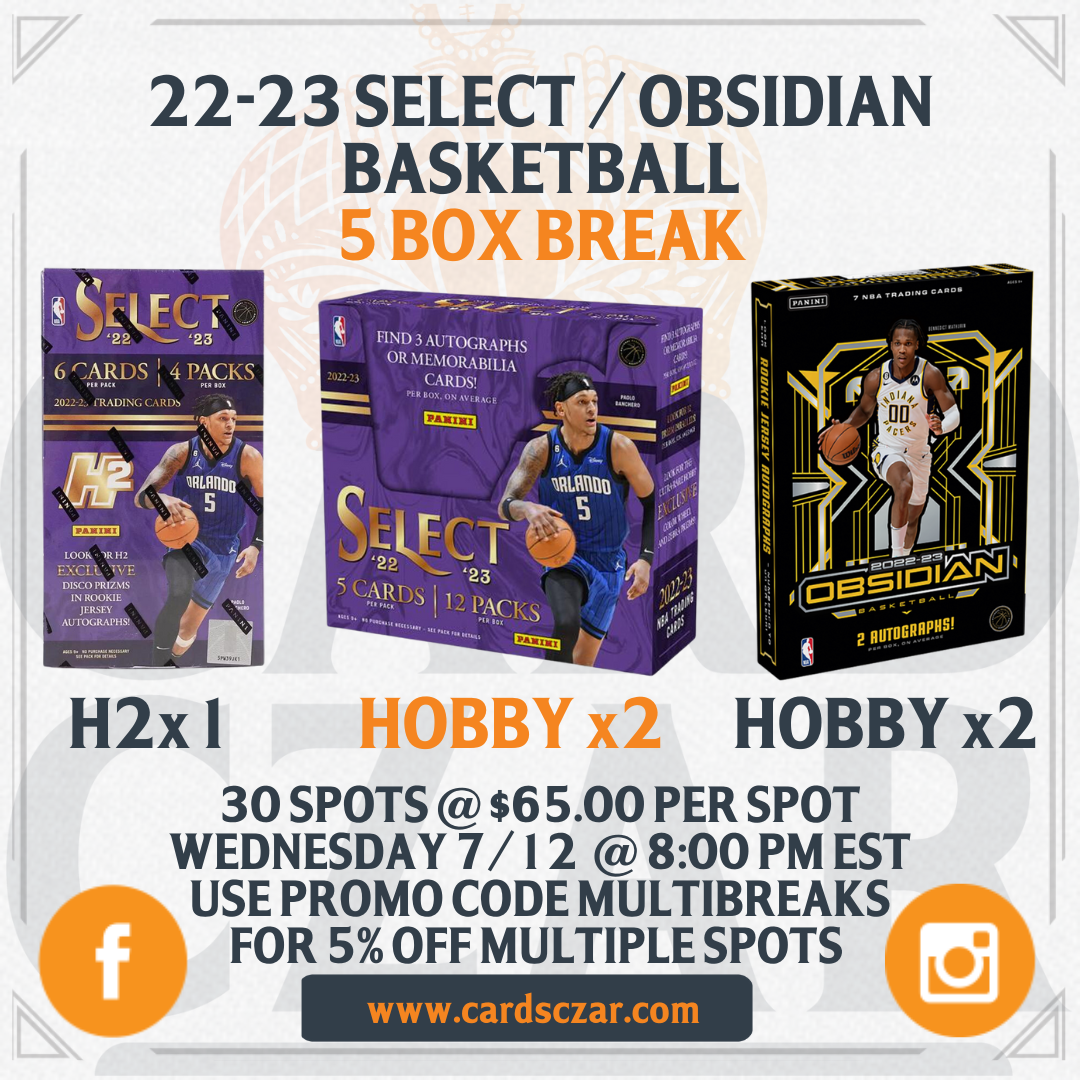 2022-23 Panini Select / Obsidian Basketball 5 Box Break We took a week off from the breaks with last week's holiday but we are BACK this week with some shiny new basketball sets to break! Select, Select H2 and Obsidian are some of the most sought after sets in the hobby and we have 5... View Article