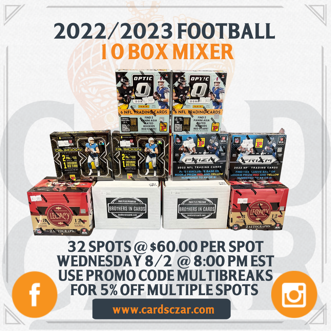 2022/2023 10 Football Box Mixer Card Czar is welcoming Brothers In Cards into our breaks! What's Brothers In Cards, well let me tell you. Each of their Gold boxes have 9 random 2022 Football Hobby packs inside of them. In this edition, each box is guaranteed to have a pack from 2022 Chronicles and Donruss... View Article