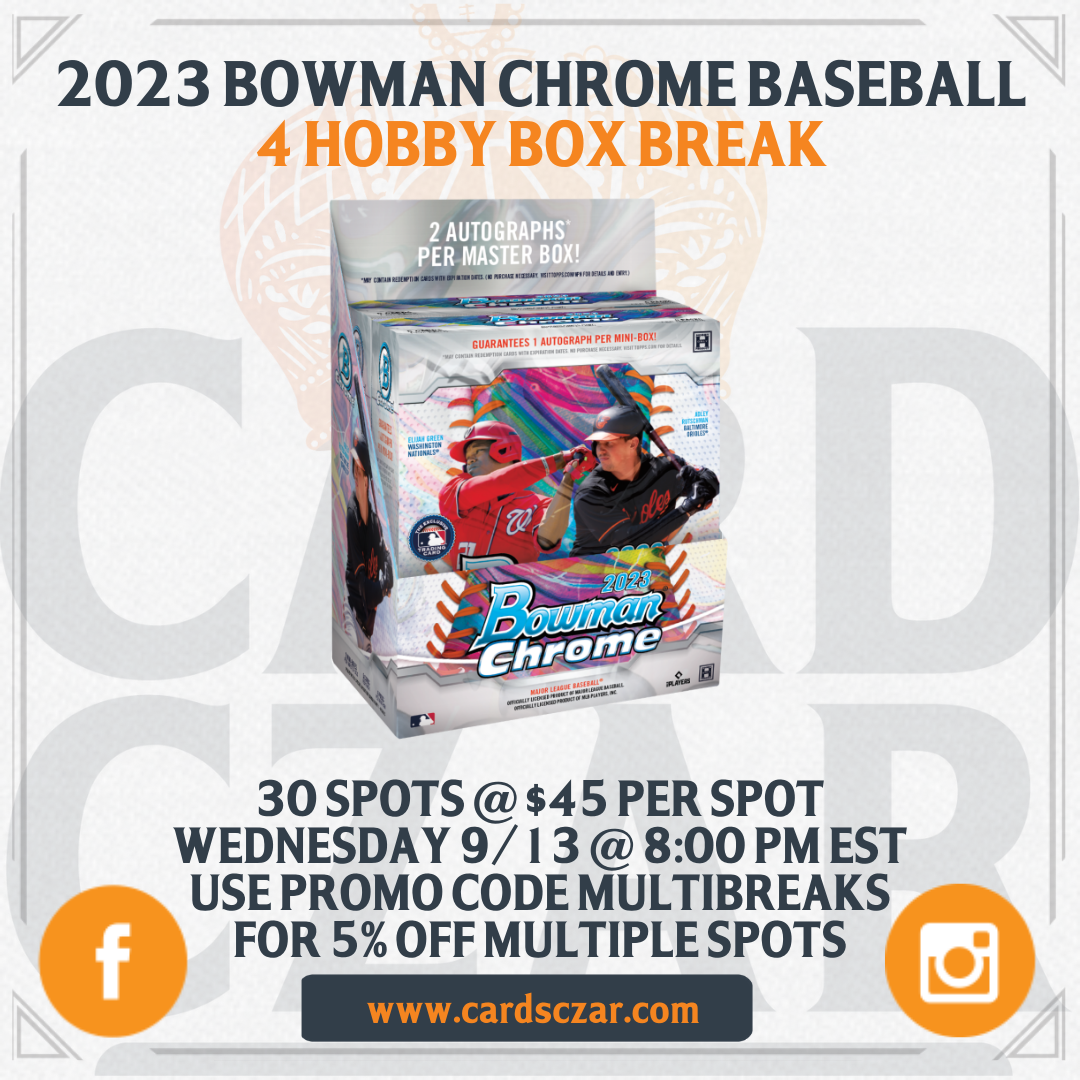 2023 Bowman Chrome Baseball 4 Hobby Box Break Czar does BASEBALL?!? Say what?! As they always say, smoke em if you got em and we will have plenty of the hottest product in recent memory...2023 Bowman Chrome Baseball! This break will be: 2023 Bowman Chrome Hobby x 4 What's in the break? (On Average): 8... View Article