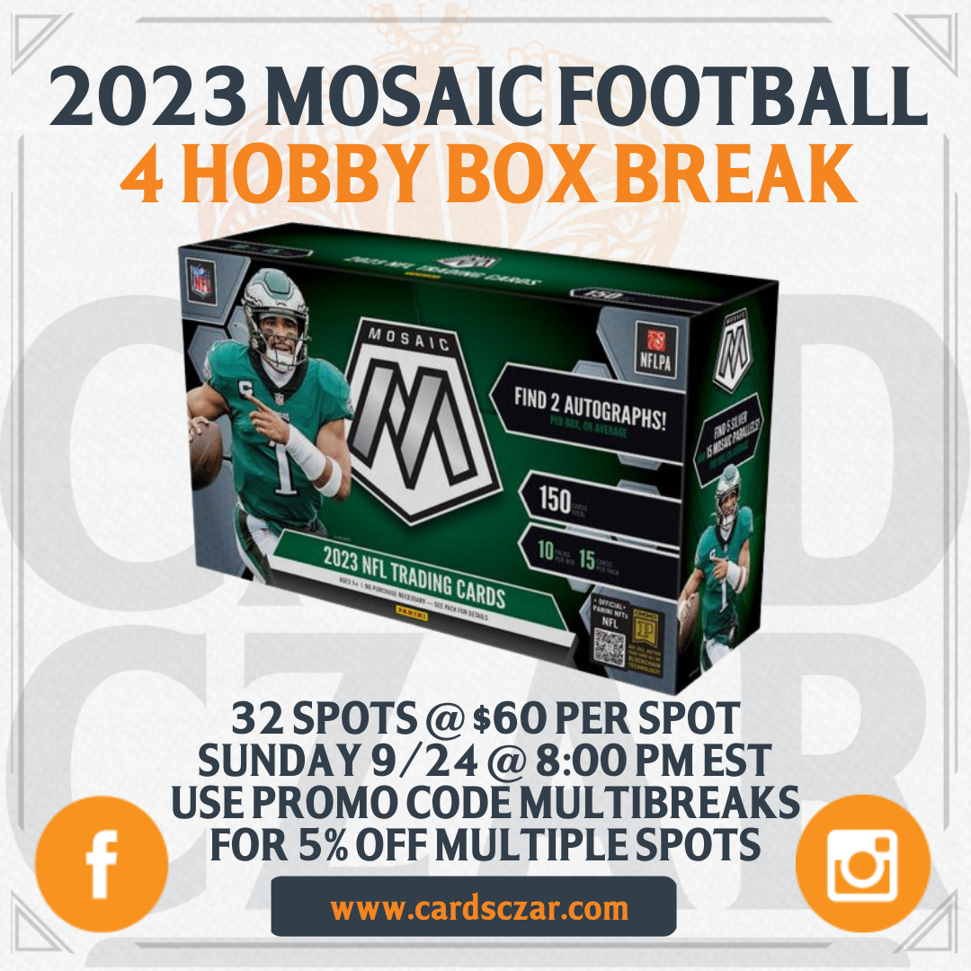 2023 Mosaic Football 4 Hobby Box Break BRINGING BACK THE SUNDAY NIGHT BREAKS! With trade night happening next Wednesday night, we wanted to make sure we were still able to break 2023 Mosaic Football (Friday 9/22 release), so we are working OVERTIME and will be running a second break on Sunday night during Sunday Night... View Article