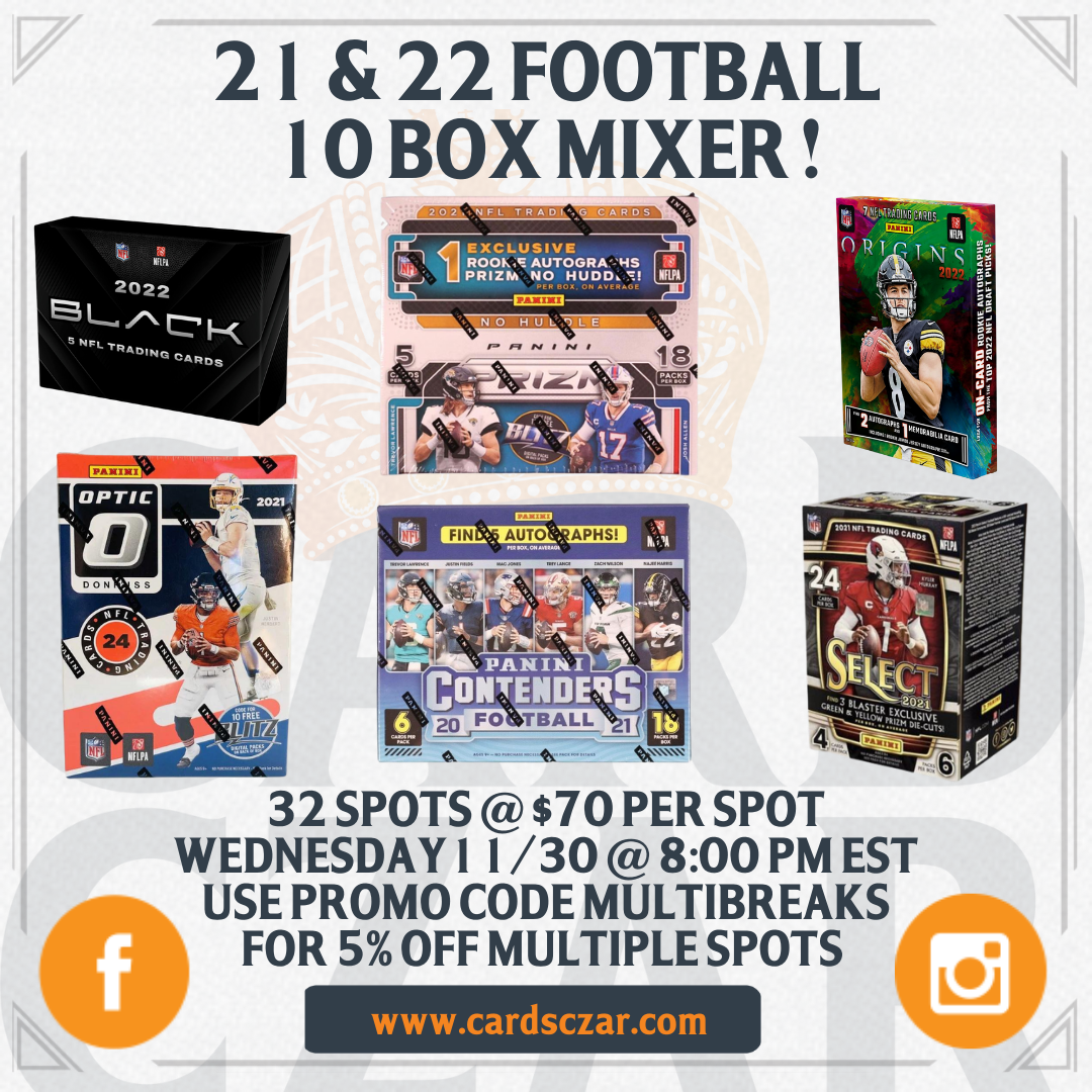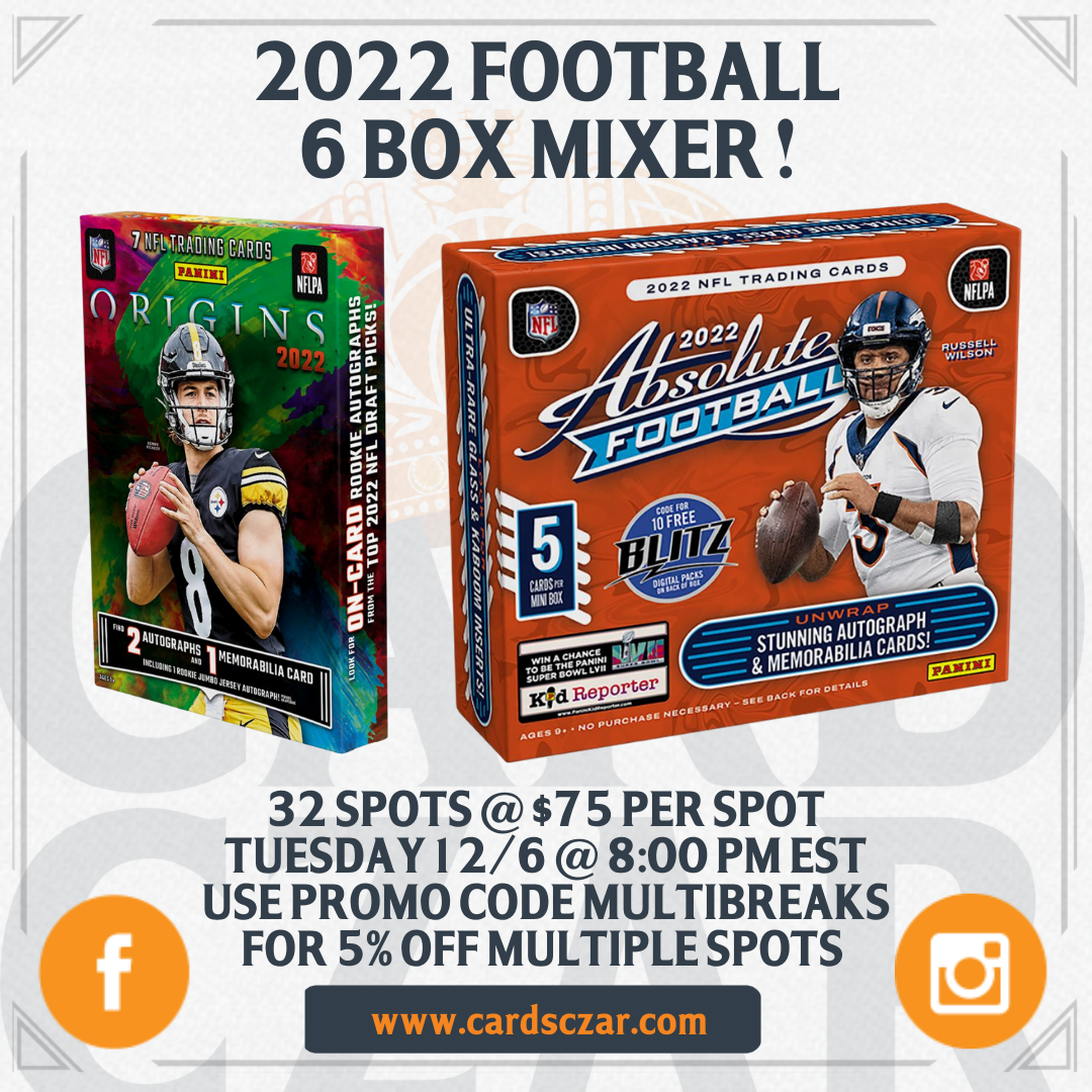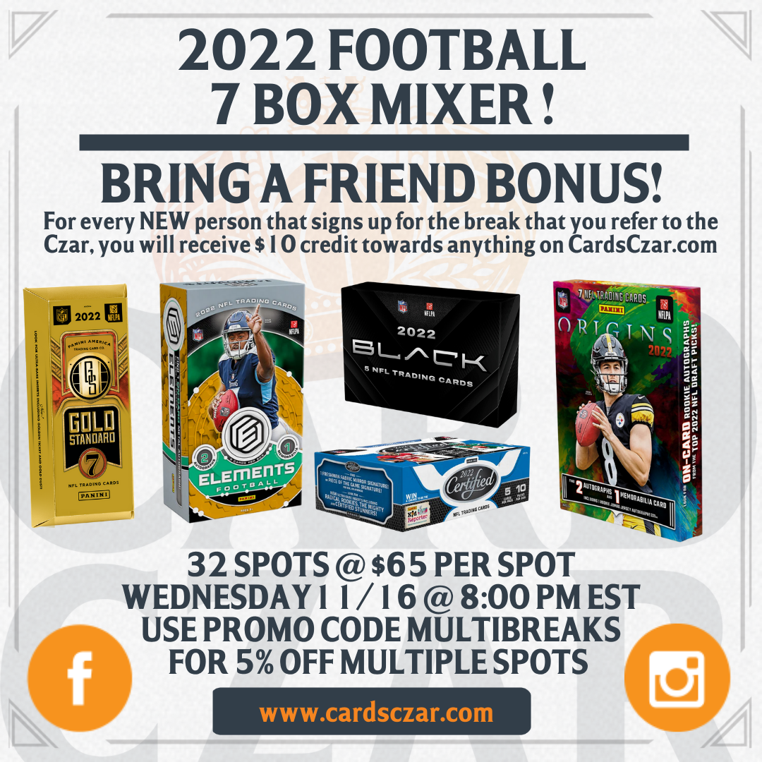 2022 Football 7 Hobby Box Mixer Will we hit some more 1 of 1s? We will find out Wednesday night! WE WON'T STOP THIS FORMAT UNTIL WE ARE DONE HITTING FIRE IN OUR BREAKS!!!! Don't forget to refer a friend for $10 credit to ANYTHING on CardsCzar.com! The break will be: 2022 Origins x 2... View Article