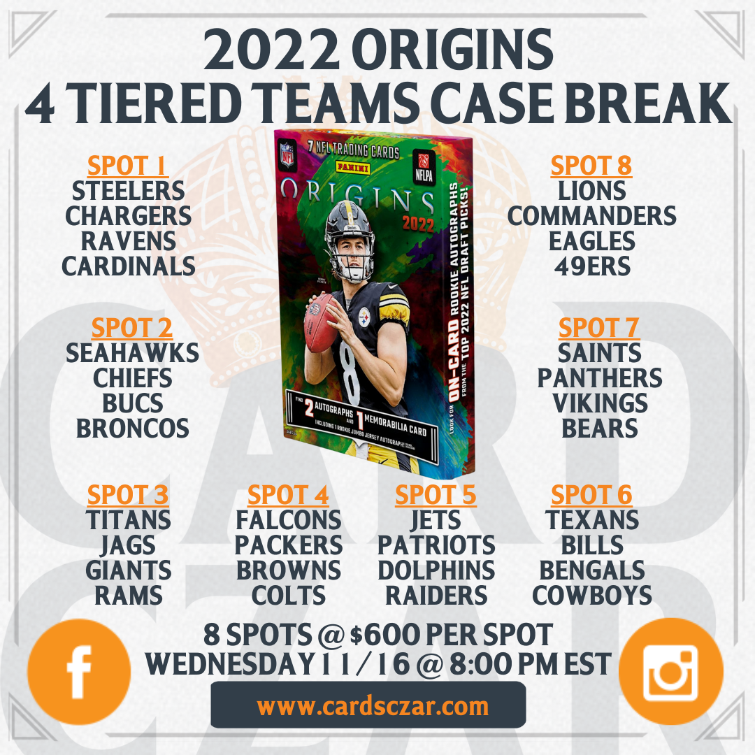 2022 Origins Football 4 Tiered Teams Case Break Case hits! RPAs! On Card Autos! Serial Numbered card and MORE in this Full Case (16 Box) Break! Each spot will receive 4 tiered teams! The tiered teams list is: Steelers, Chargers, Ravens, Cardinals Seahawks, Chiefs, Bucs, Broncos Titans, Jags, Giants, Rams Falcons, Packers, Browns, Colts Jets,... View Article