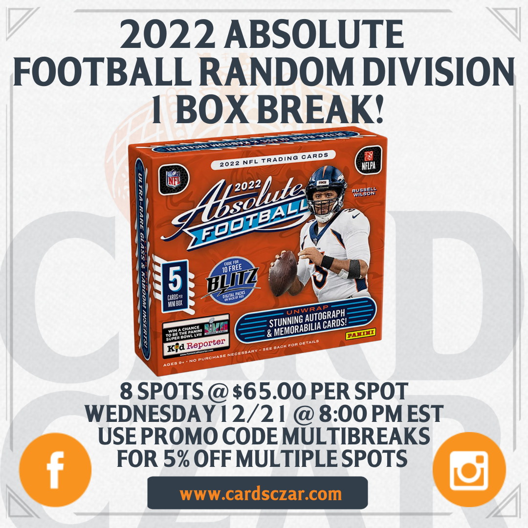 2022 Absolute Football Random Division 1 Box Break In the interest of keeping prices lowwww for you all, but the hit potential high, we are running multiple Absolute breaks on Wednesday night with different price points! This break will be: 2022 Absolute Hobby x 1 What's in the break? (On Average) 2 Autographs 1 Memorabilia... View Article