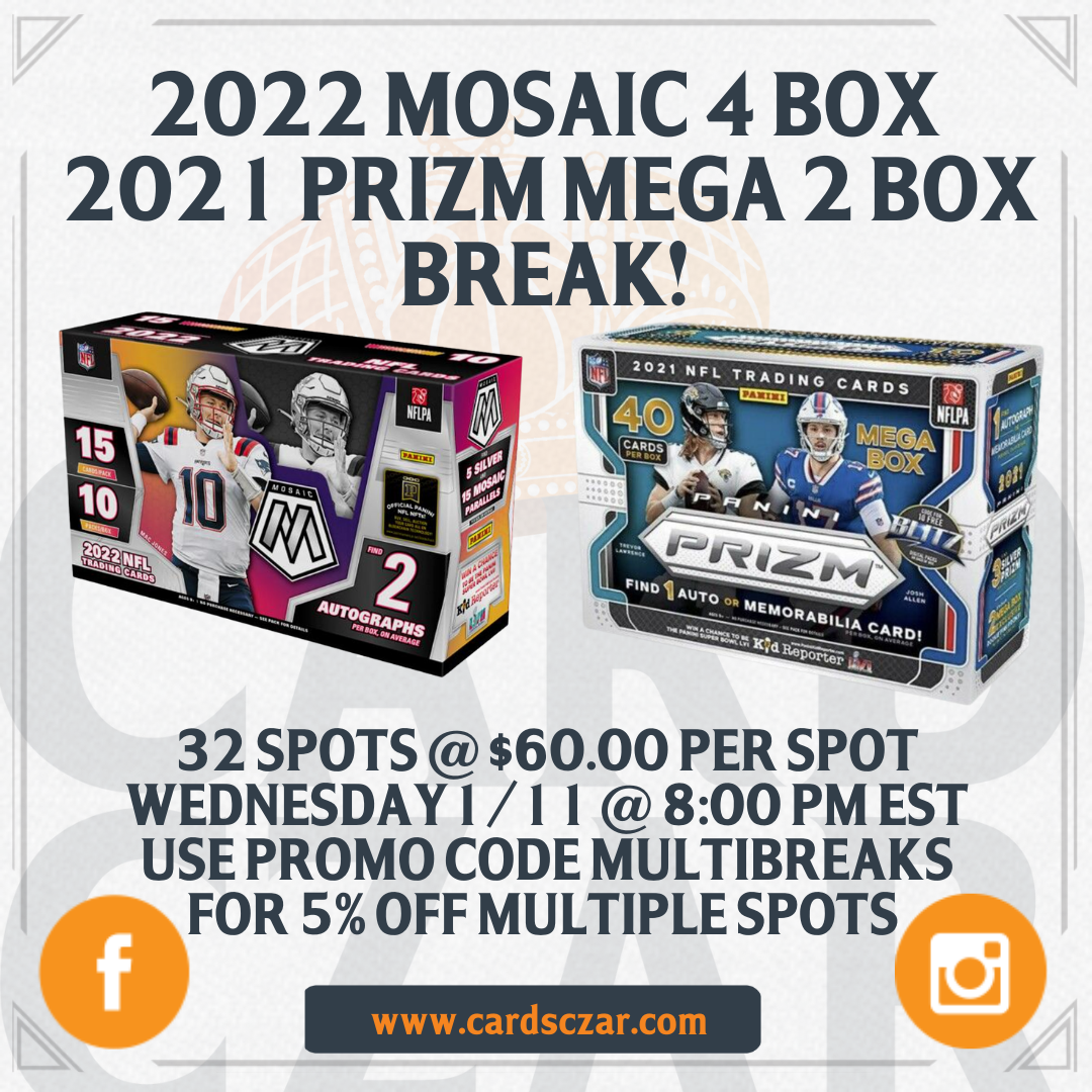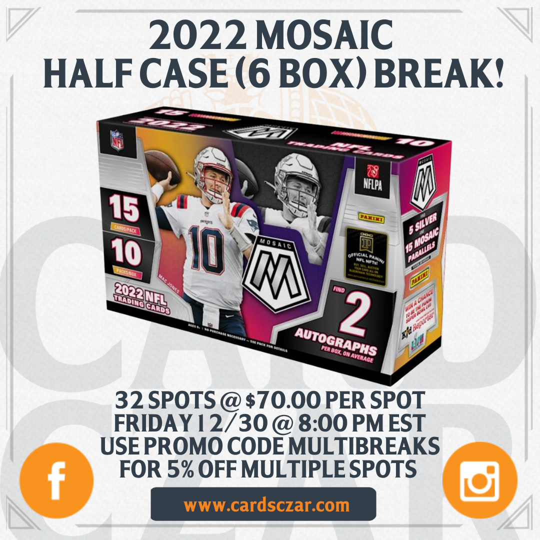 2022 Mosaic Football Half Case (6 Hobby Box) Break The much ballyhooed MOSAIC is back in 2022 with case hits, parallels, rookies and autos galore! We will be breaking on RELEASE night! This break will be: 2022 Mosaic Hobby x 6 What's in the break? (On Average) 12 Autographs 30 Silvers 90 Other Mosaic Parallels... View Article