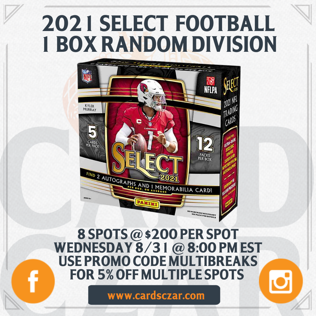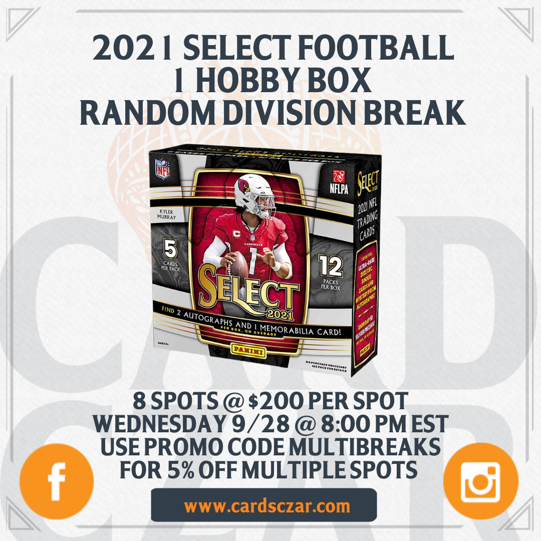 2021 Select Football 1 Box Random Division Break We are bringing 2021 Select back! What's in the break? (On Average) 2 Autographs (or more) 1 Memorabilia Card Tons of silver, parallels and rookies ALL CARDS SHIP! USE PROMO CODE MULTIBREAKS FOR 5% MULTIPLE SPOTS IN ANY BREAK 8 Spots @ $200.00 per Spot Via Instagram... View Article