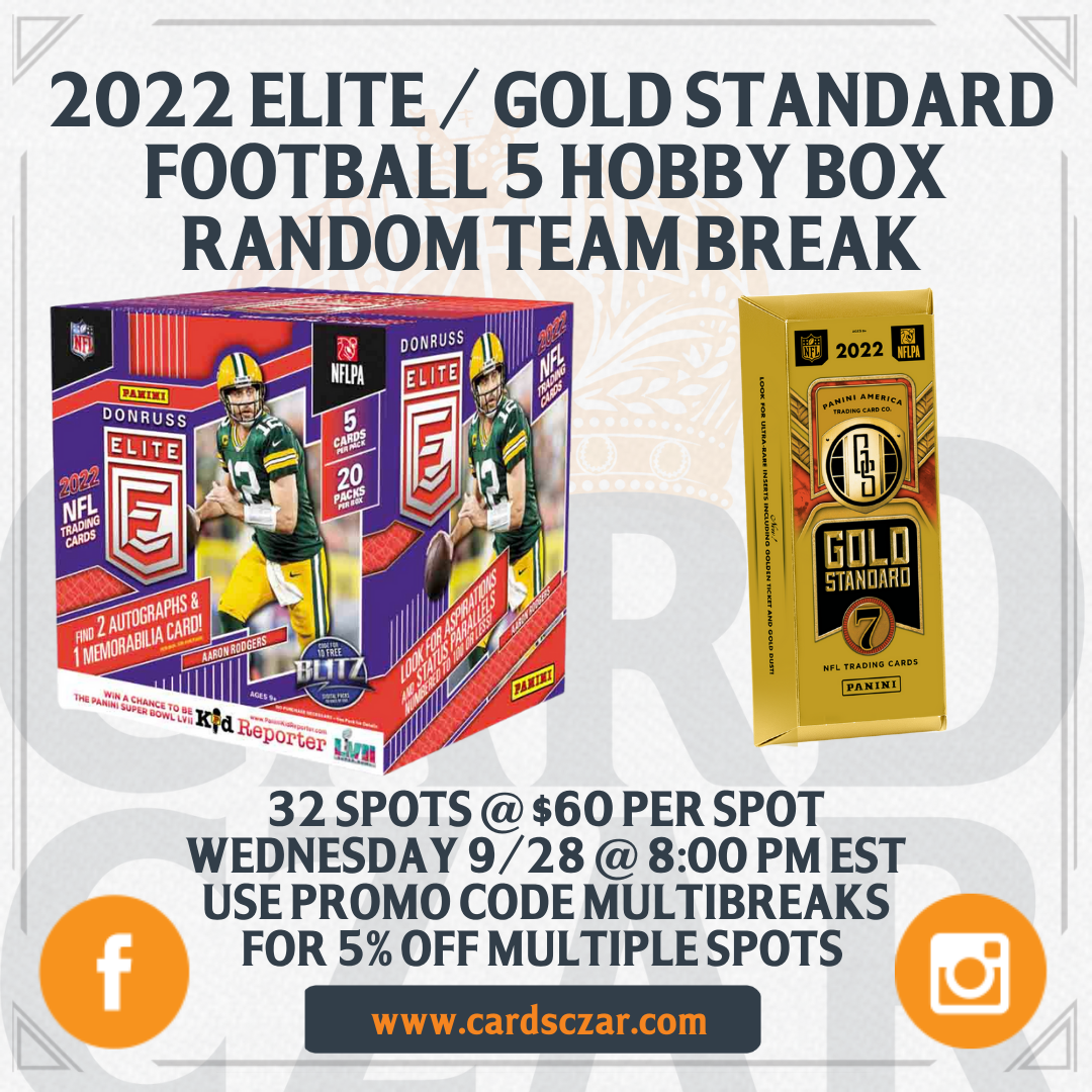 2022 Elite / Gold Standard 5 Box Break We will be breaking 3 boxes of 2022 Elite and 2 boxes of Gold Standard on release day! What's in the break? (On Average) 16 Autographs  or Memorabilia Cards A whole lot of inserts, parallels and rookies ALL CARDS SHIP! USE PROMO CODE MULTIBREAKS FOR 5% MULTIPLE... View Article
