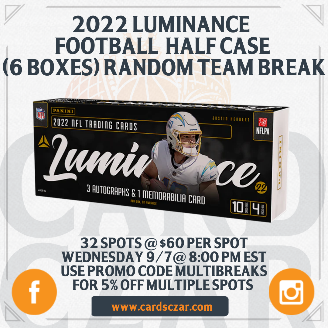 2022 Luminance Football Half Case (6 Box) Break Luminance is such a good looking set, so let's rip half a case?! With beautiful full bleed imagery, Luminance continues to be a favorite of Card Czar each year it releases! What's in the break? (On Average) 18 Autographs (or more) 6 Memorabilia Cards 30 Parallels 24... View Article