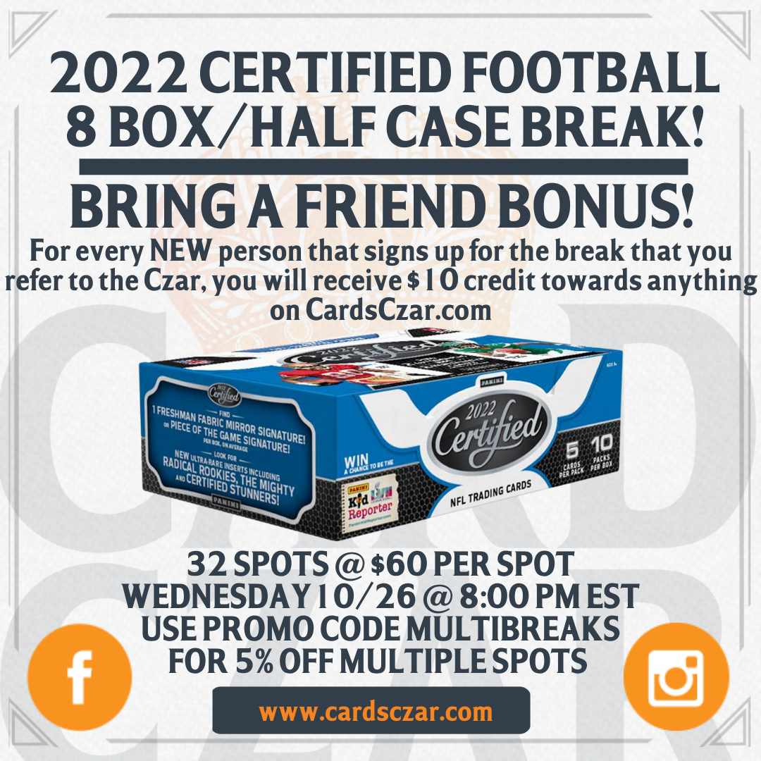 2022 Certified Half Case (8 Box) Break Chunky Freshman Fabric RPAs are back for 2022! Come get some of the brand new ink from the hottest 2022 rookies! What's in the break? (On Average) 16 Autographs 16 Memorabilia Cards 80 Inserts 16 Rookies or Rookie Parallels 24 Parallels ALL CARDS SHIP! USE PROMO CODE MULTIBREAKS... View Article