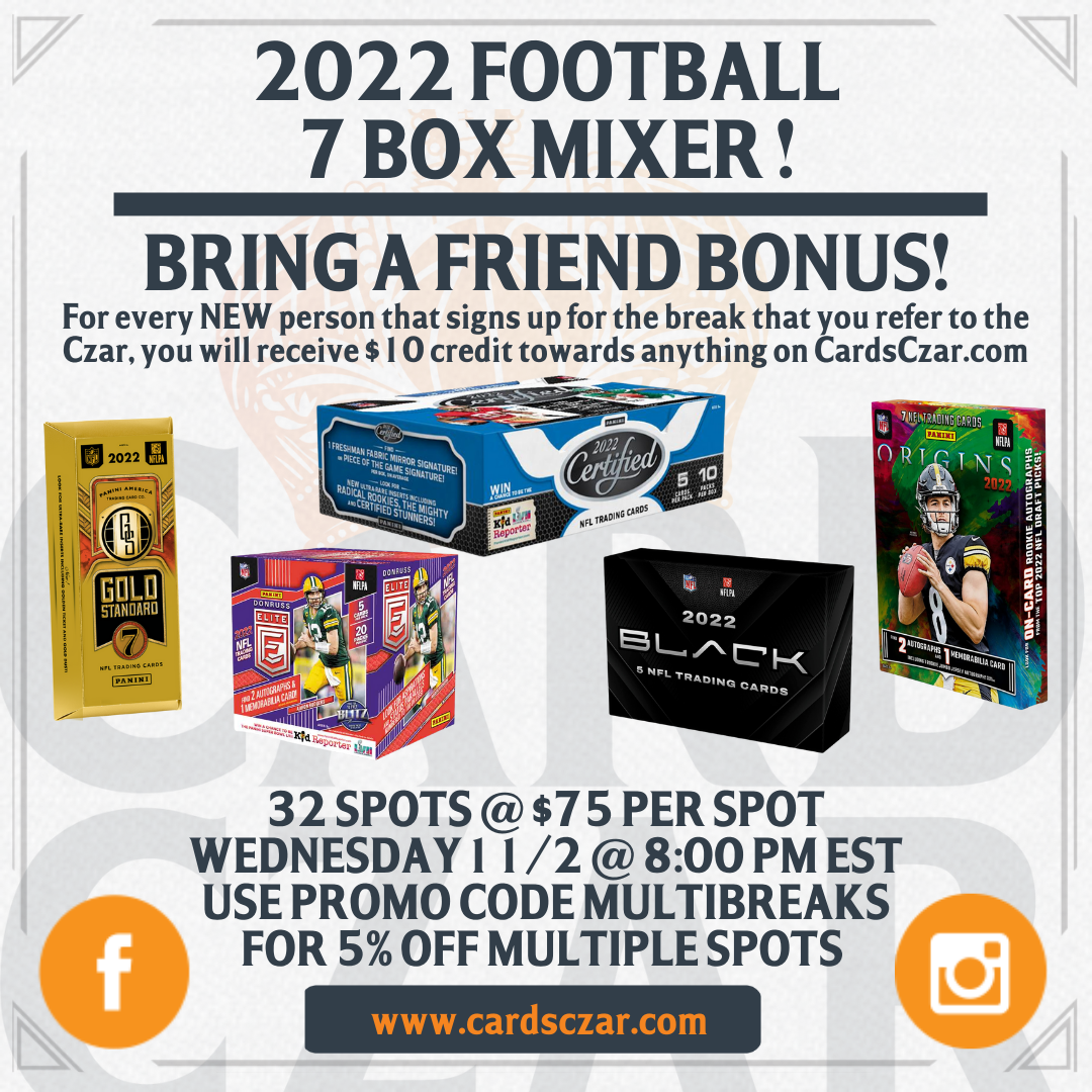 2022 Football 7 Hobby Box Mixer Let's run back some 2022 products and the BRAND NEW Origins! Don't forget to refer a friend for $10 credit to ANYTHING on CardsCzar.com! The break will be: 2022 Origins x 2 2022 Certified x 2 2022 Black x 1 2022 Gold Standard x 1 2022 Elite x 1... View Article