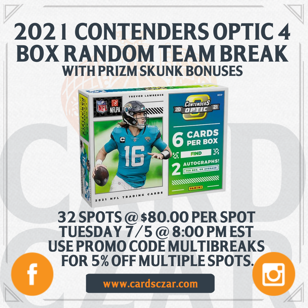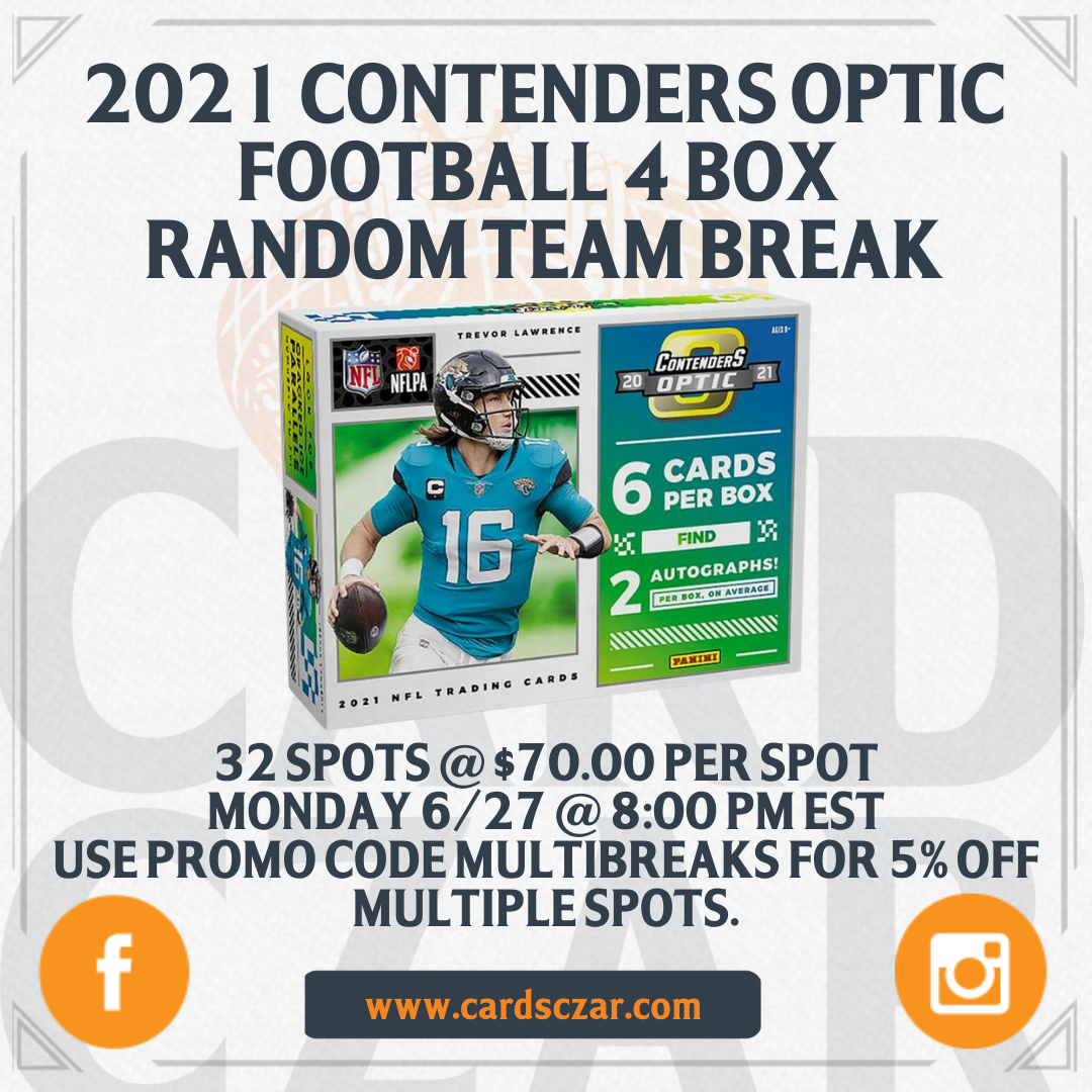 2021 Contenders Optic Football 4 Hobby Box Break A Czar favorite, we will be ripping 2021 Contenders Optic Monday night! What's in the break? (On Average) 8 Autographs 8 Base Cards 4 Inserts 4 Parallels Skunk Bonuses! ALL CARDS SHIP! USE PROMO CODE MULTIBREAKS FOR 5% MULTIPLE SPOTS IN ANY BREAK 32 Spots @ $70.00... View Article