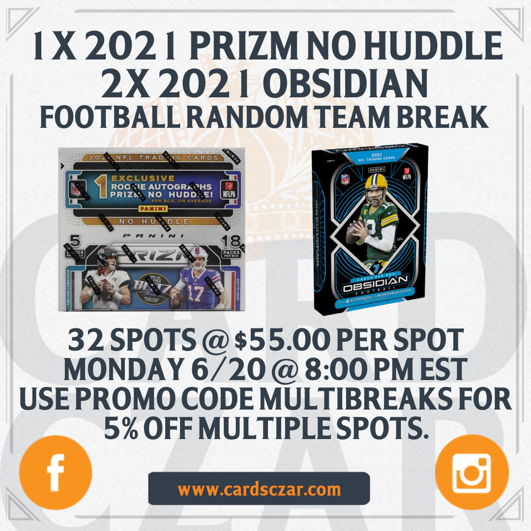 2021 Prizm Football No Huddle And 2 Obsidian Random Team 3 Box Break Prizm Football and Obsidian Are BACK at CardsCzar.com! What's in the break? 1 Prizm No Huddle Autograph 8 Obsidian Autograph or Memorabilia Cards 7 No Huddle Inserts 4 No Huddle Silvers 6 No Huddle Serial Numbered Prizms 12 Rookies ALL CARDS SHIP!... View Article