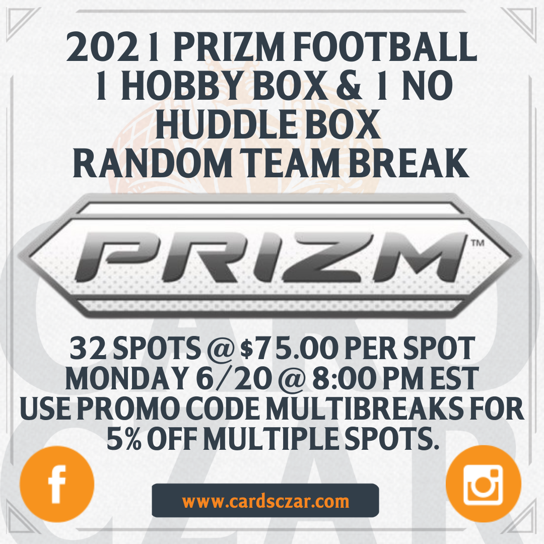 2021 Prizm Football Hobby & No Huddle 2 Box Random Team Break Prizm Football is BACK at CardsCzar.com! What's in the break? 2 Autographs and 1 No Huddle Autograph 5 Inserts 7 No Huddle Inserts 4 Silvers 4 No Huddle Silver 10 Serial Numbered Prizms 6 No Huddle Serial Numbered Prizms 24 Rookies ALL CARDS... View Article