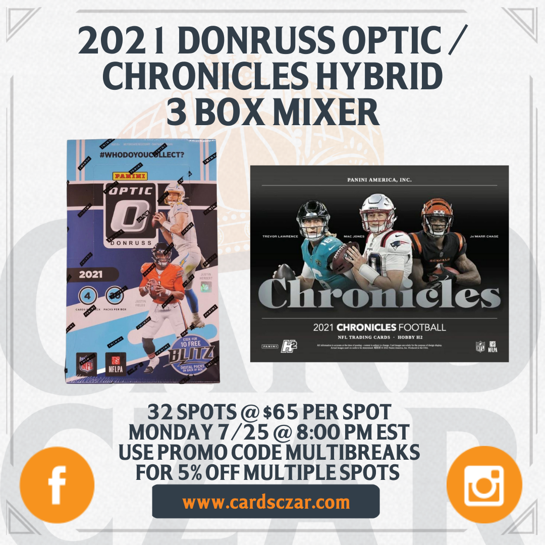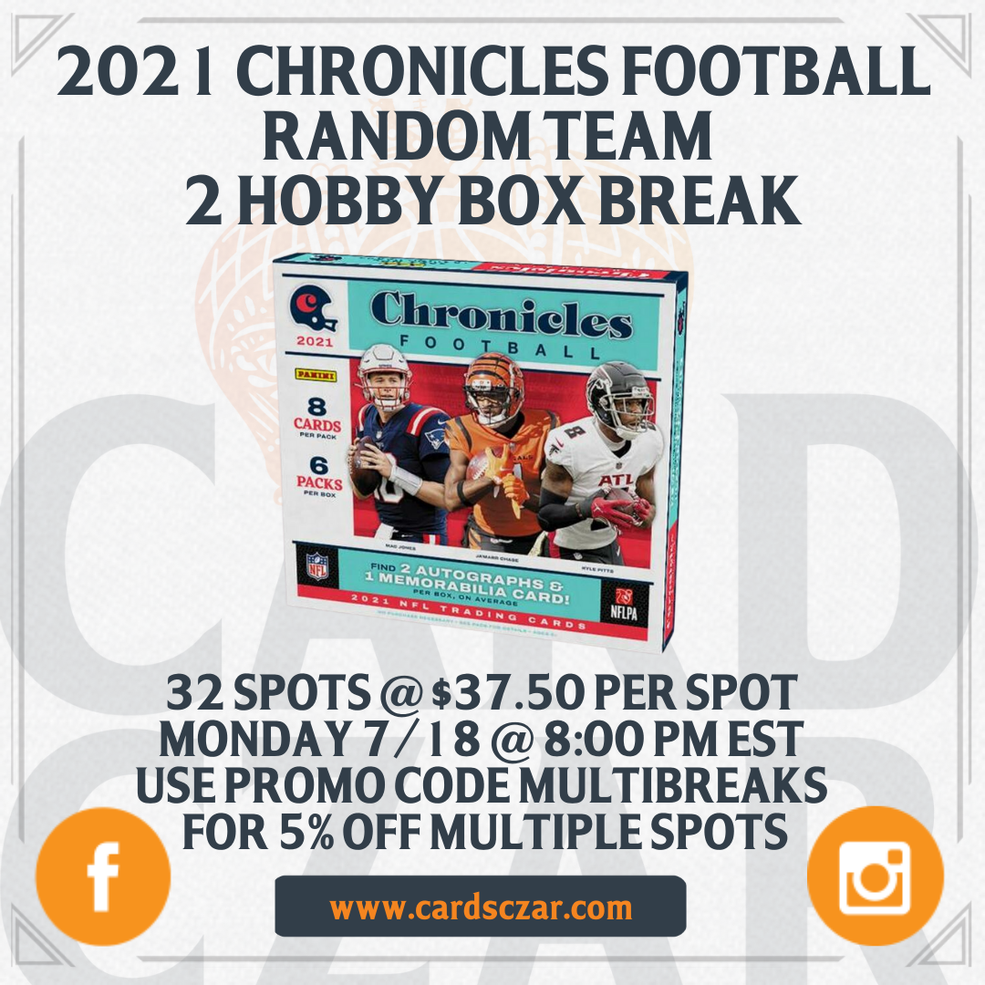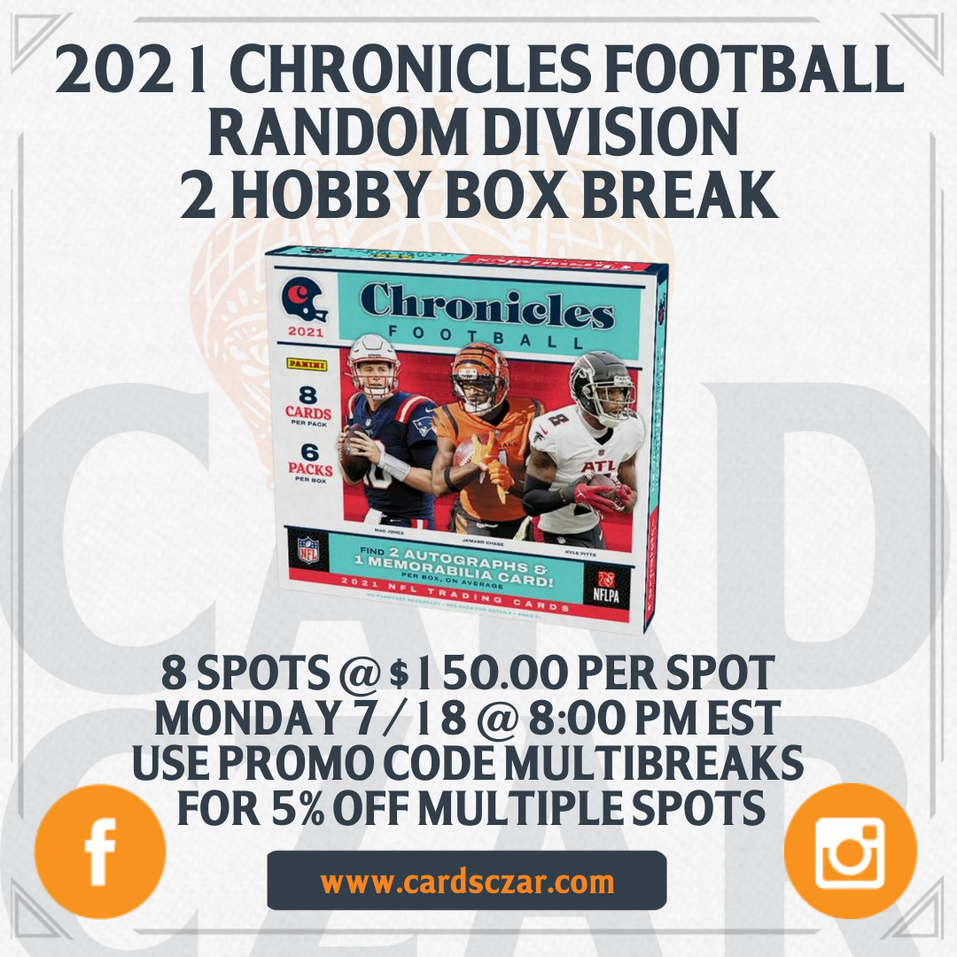 2021 Chronicles Football 2 Hobby Box Random Division Break The set we have all been waiting for after last year's monsters....CHRONICLES IS BACK!!!!!! What's in the break? (On Average) 4 Autographs 2 Memorabilia Cards 52 Inserts 4 Silvers 8 #'d parallels ALL CARDS SHIP! USE PROMO CODE MULTIBREAKS FOR 5% MULTIPLE SPOTS IN ANY BREAK... View Article