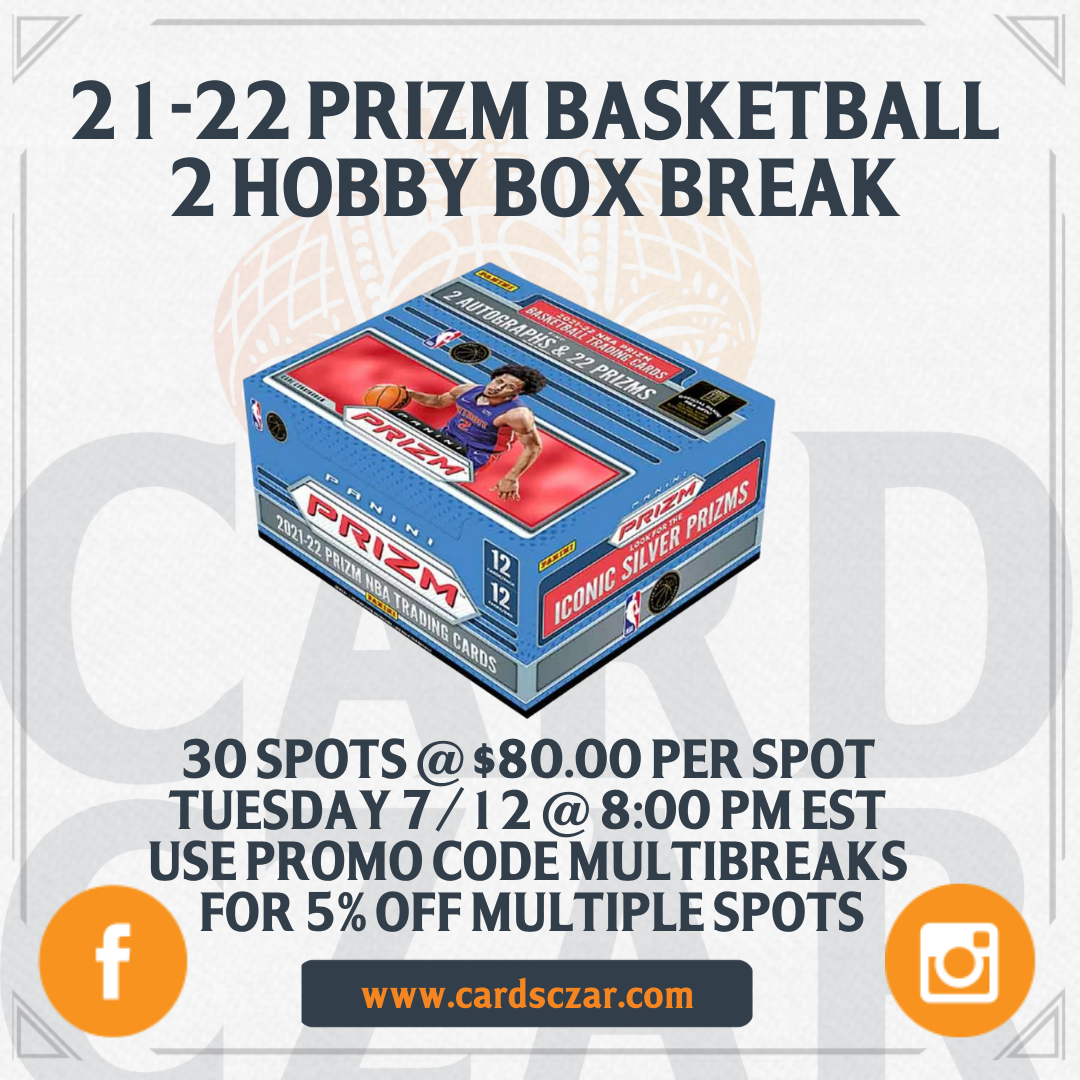 2021-22 Prizm Basketball 2 Hobby Box Break! The highly anticipated 2021-22 Prizm Basketball is dropping and we will be breaking on Tuesday night! What's in the break? (On Average) 4 Autographs 20 Inserts 44 Prizms ALL CARDS SHIP! USE PROMO CODE MULTIBREAKS FOR 5% MULTIPLE SPOTS IN ANY BREAK 30 Spots @ $80.00 per Spot... View Article