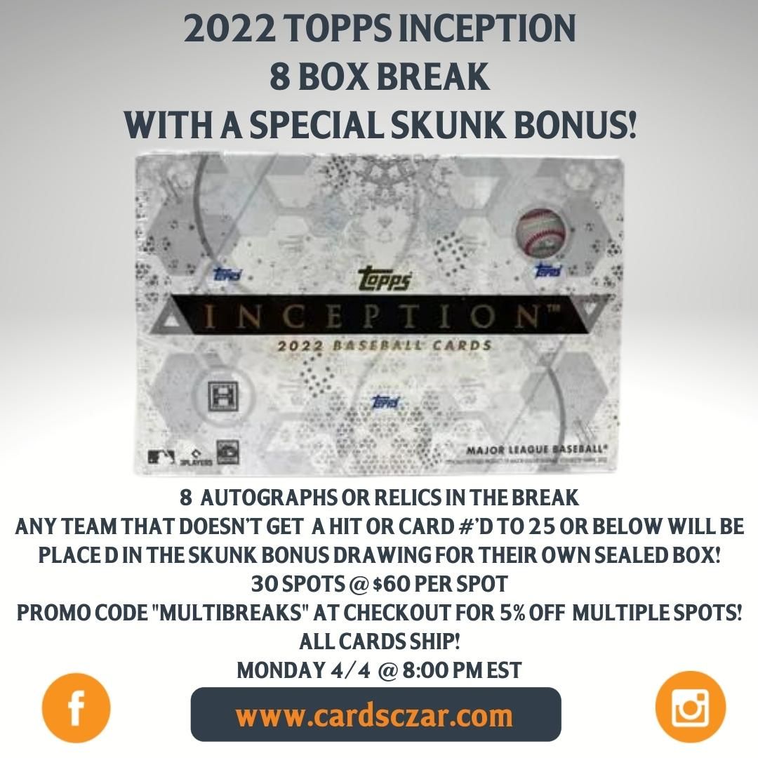 2022 Topps Inception 8 Hobby Box Break Let's rip the brand new 2022 Topps Inception Baseball set and hit 8 autographs or patch cards in the break! Special to this break, any team who gets skunked (doesn't receive a hit or any card serial #'d lower than 25) will be entered into the special skunk... View Article