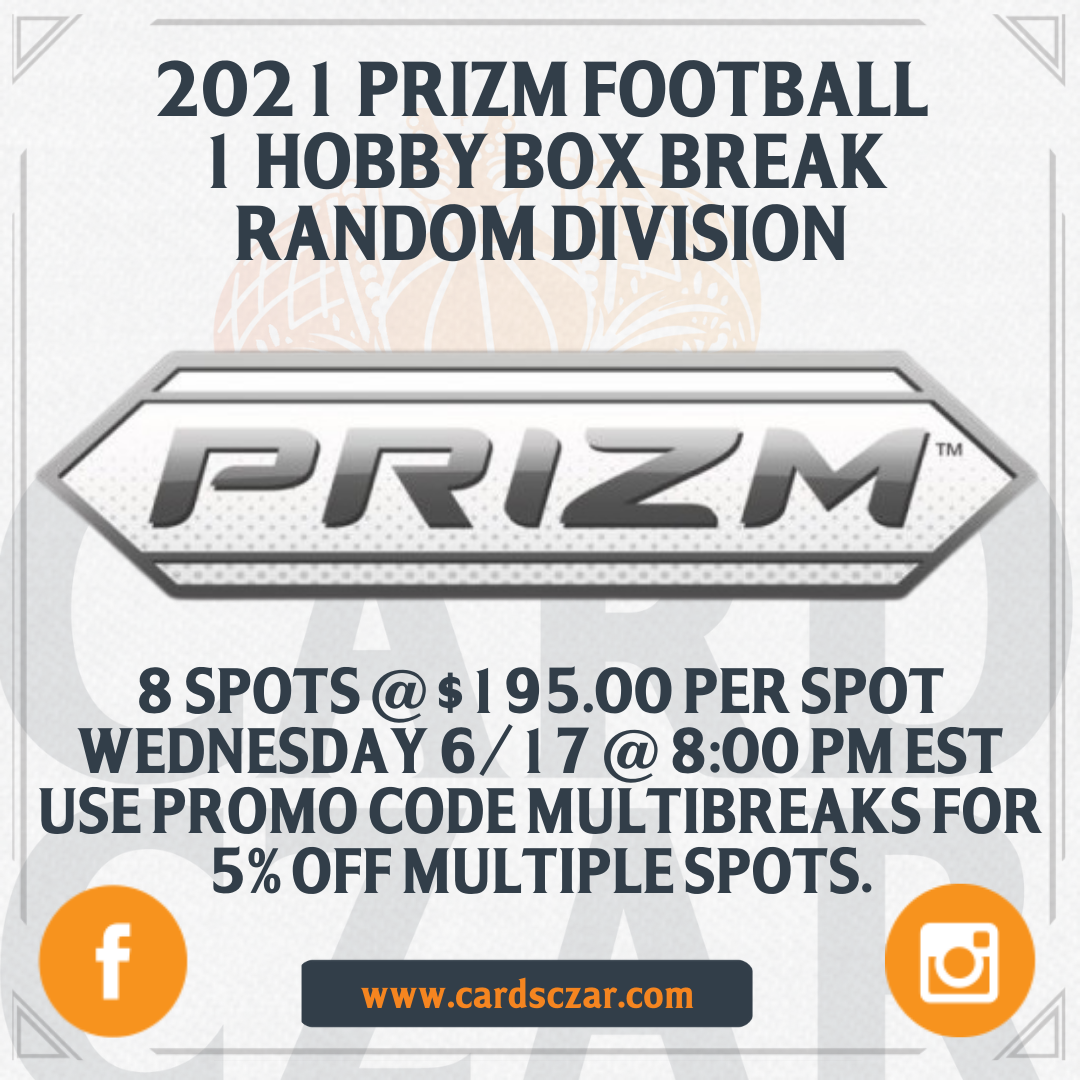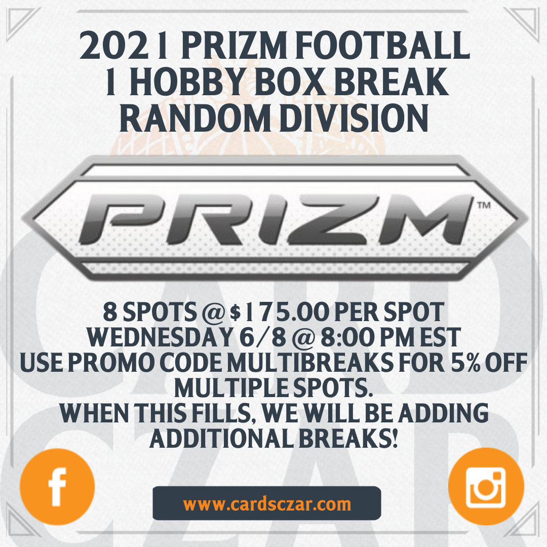 2021 Prizm Football 1 Hobby Box Random Division Break The most anticipated release is here...2021 Prizm Football! We will be running plenty of different breaks on Wednesday June 8th (sorry for the delay) including this 1 Hobby Box Random Division Break What's in the break? 2 Autographs 5 Inserts 4 Silvers 10 Serial Numbered Prizms... View Article