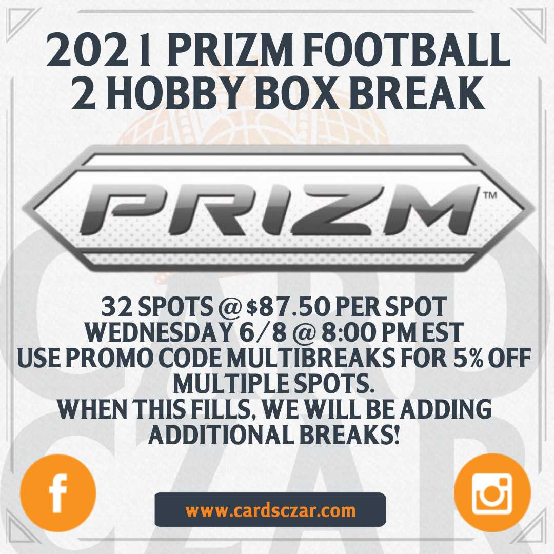 2021 Prizm Football 1 Hobby Box Random Division Break #2 Prizm Football is BACK at CardsCzar.com! What's in the break? 2 Autographs 5 Inserts 4 Silvers 10 Serial Numbered Prizms 24 Rookies ALL CARDS SHIP! USE PROMO CODE MULTIBREAKS FOR 5% MULTIPLE SPOTS IN ANY BREAK 8 Spots @ $195.00 per Spot Via Instagram Live... View Article