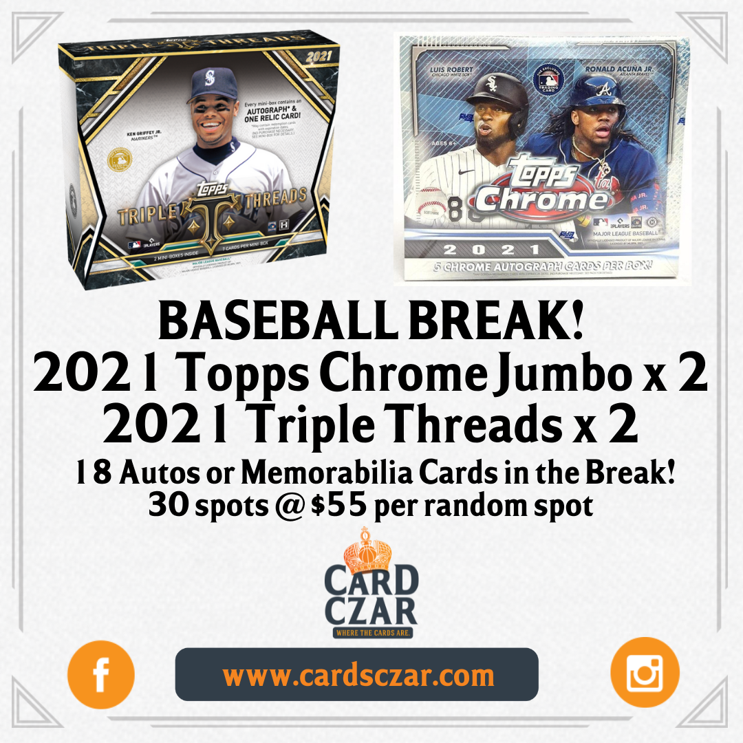 2021 Topps Chrome and Topps Triple Threads 4 Hobby Box Break 18 autographs or memorabilia cards, as well as a bunch of parallels, refractors and rookie in this break. All cards ship! 30 Spots @ $55 per Spot Via Instagram Live Dates and times may change.