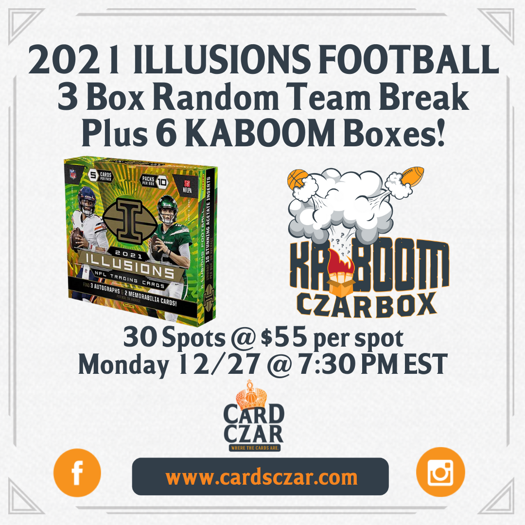 2021 Illusions 3 Hobby Box Break PLUS 6 KaBOOM Boxes! 9 autographs, 6 memorabilia cards, 15 parallels, and 30 acetate inserts/parallels (on average) will be pulled out of Illusions, with more to come out of the KaBOOM Boxes! 32 Spots @ $55 per Spot Via Instagram Live Dates and times may change.