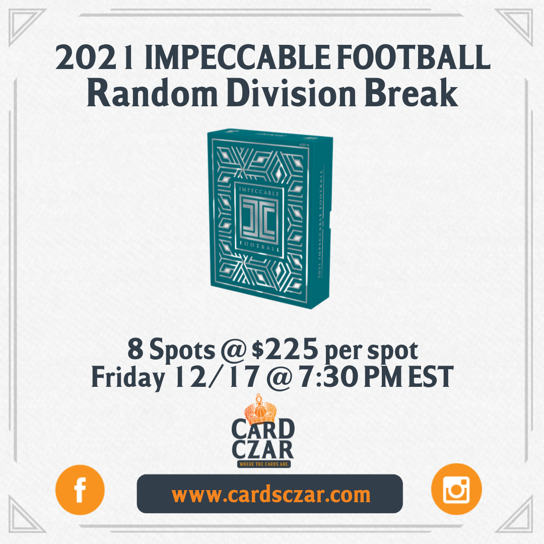 2021 Impeccable Football Hobby Random Division Break 8 cards per box with at least 5 autos/patch auto cards and 3 #'d parallels with the chance for Gold or Silver bar CASE HITS. Skunk bonuses for those who do not hit in the break! 8 Spots @ $225 per Spot...we are $200 lower than the big... View Article
