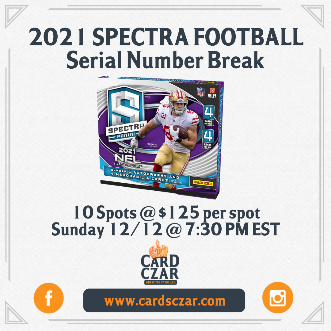 2021 Spectra Football Hobby Box Serial Number Break Serial number breaks work as such. We will randomize all the names of the people in the break and then randomize the numbers 0-9. Numbers will be matched to names. For example, if you get number 2, you get every card that ends with a 2 on... View Article