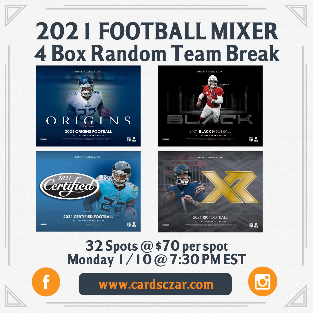 2021 Football 4 Hobby Box Break 2021 Origins / 2021 Certified / 2021 Black / 2021 XR These sets were good to us in 2021, so let's RUN 'EM BACK N 2022! 8 autographs, 5 memorabilia cards, and a bunch of parallels and rookie (on average) will be pulled in this break....plus a few surprises!... View Article
