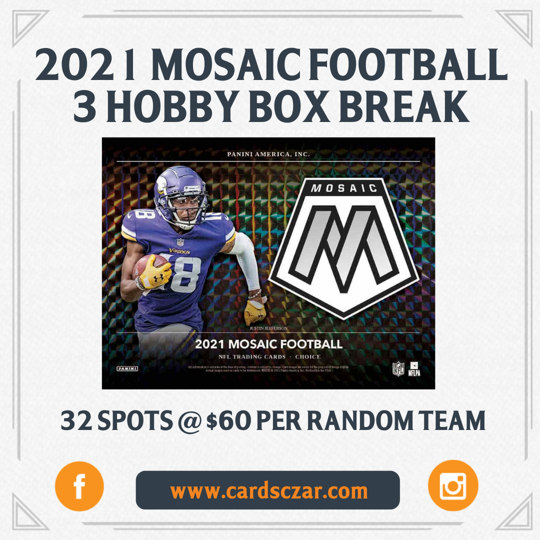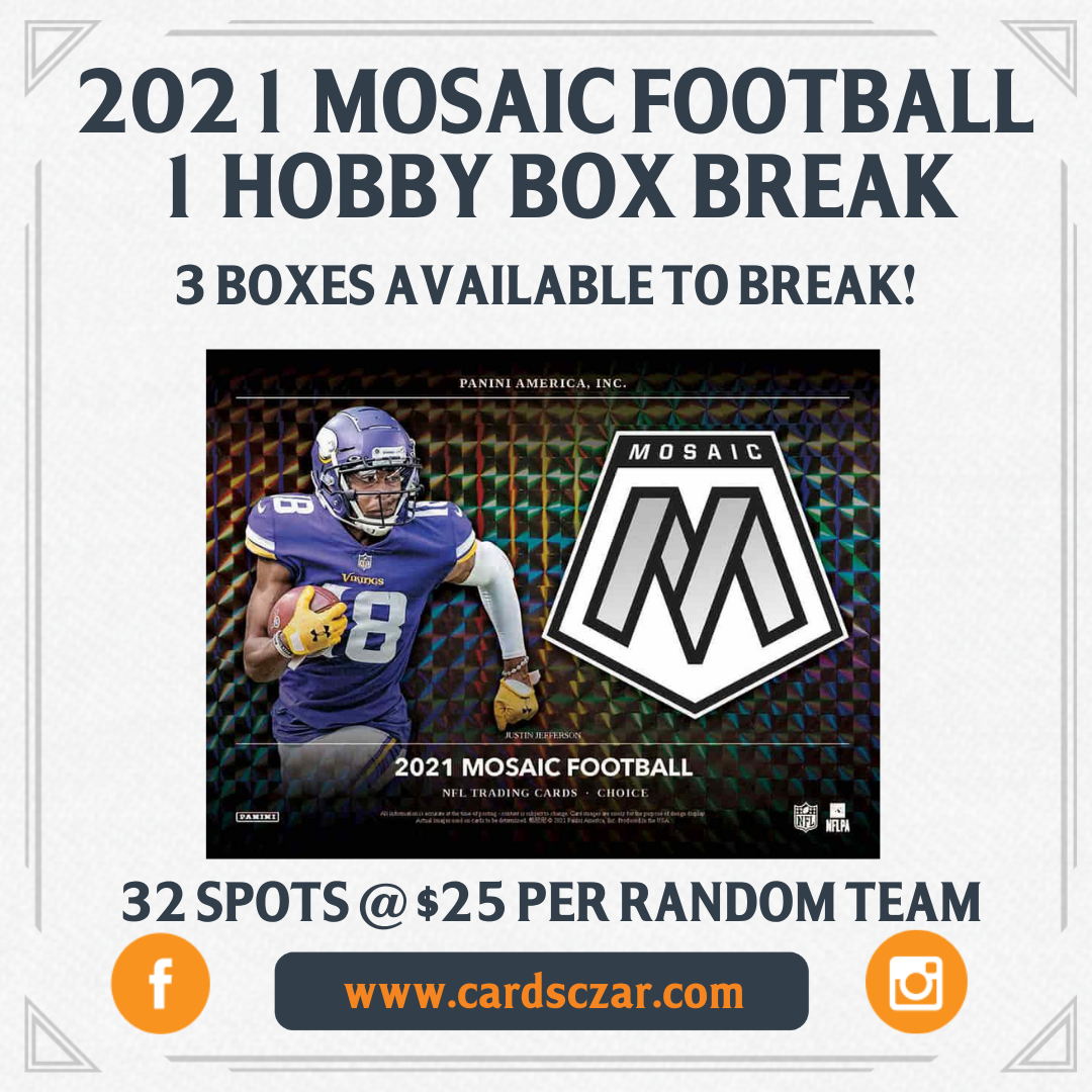 2021 Mosaic Football 1 Hobby Box Break #3 We ran a 3 box break last night, let's run it back with a few cheap 1 box breaks! One of 2020's most popular sets, Mosaic is back in 2021 to deliver some of the best designs Panini has to offer! 2 autographs, 5 Silver parallels, 10... View Article