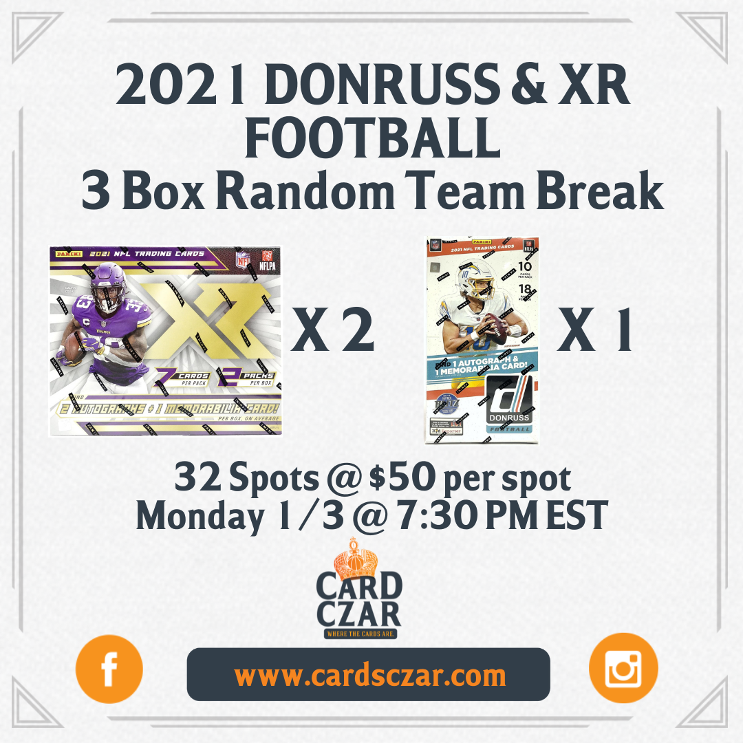 r 2021 XR (x2) / 2021 Donruss (x1) 3 Hobby Box Break! 5 autographs, 5 memorabilia cards, and a bunch of parallels and rookie (on average) will be pulled in this break....plus a few surprises! Let's go DOWNTOWN hunting! 32 Spots @ $50 per Spot Via Instagram Live Dates and times may change.