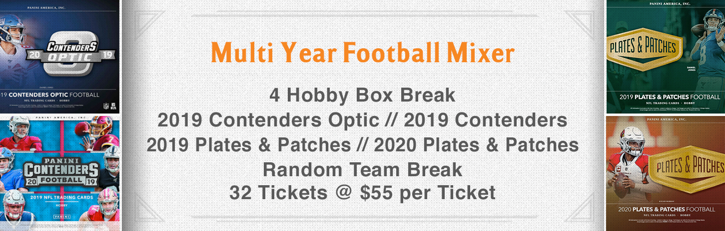 Multi Year Football Mixer 4 Box Divisional Break 32 Spots @ 55 per Spot Via Instagram Live 2019 Contenders Optic Football 2019 Contenders Football 2019 Plates and Patches Football 2020 Plates and Patches Football Let's go 11 Autographs or Relic cards! Low entry cost...plenty of opportunity to make money on this break Promo Code Multibreaks15... View Article