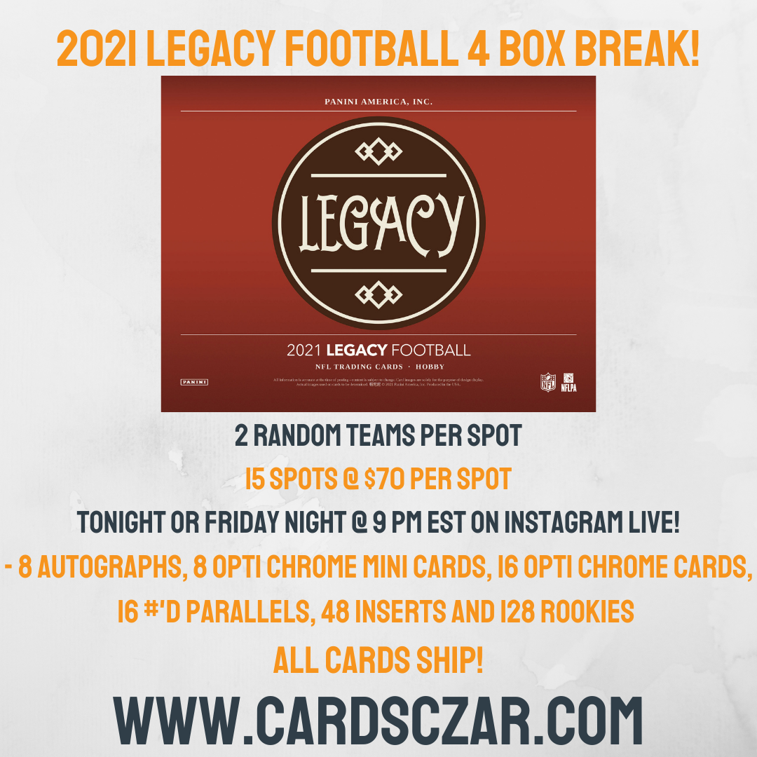 2021 LEGACY FOOTBALL 2 Random Team 4 Box Break 16 Spots @ $70 per Spot Via Instagram Live 2021 LEGACY FOOTBALL Chance for: -8 AUTOGRAPHS, 8 OPTI CHROME MINI CARDS, 16 OPTI CHROROME CARDS, 16 #'D PARALLELS, 48 INSERTS AND 128 ROOKIES! USE PROMO CODE MULTIBREAKS18 FOR 5% MULTIPLE SPOTS ALL CARDS SHIP! Dates and... View Article