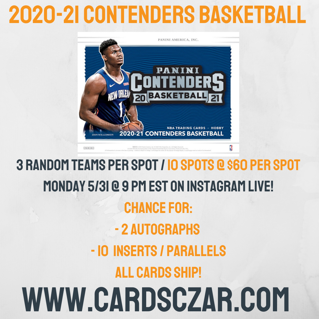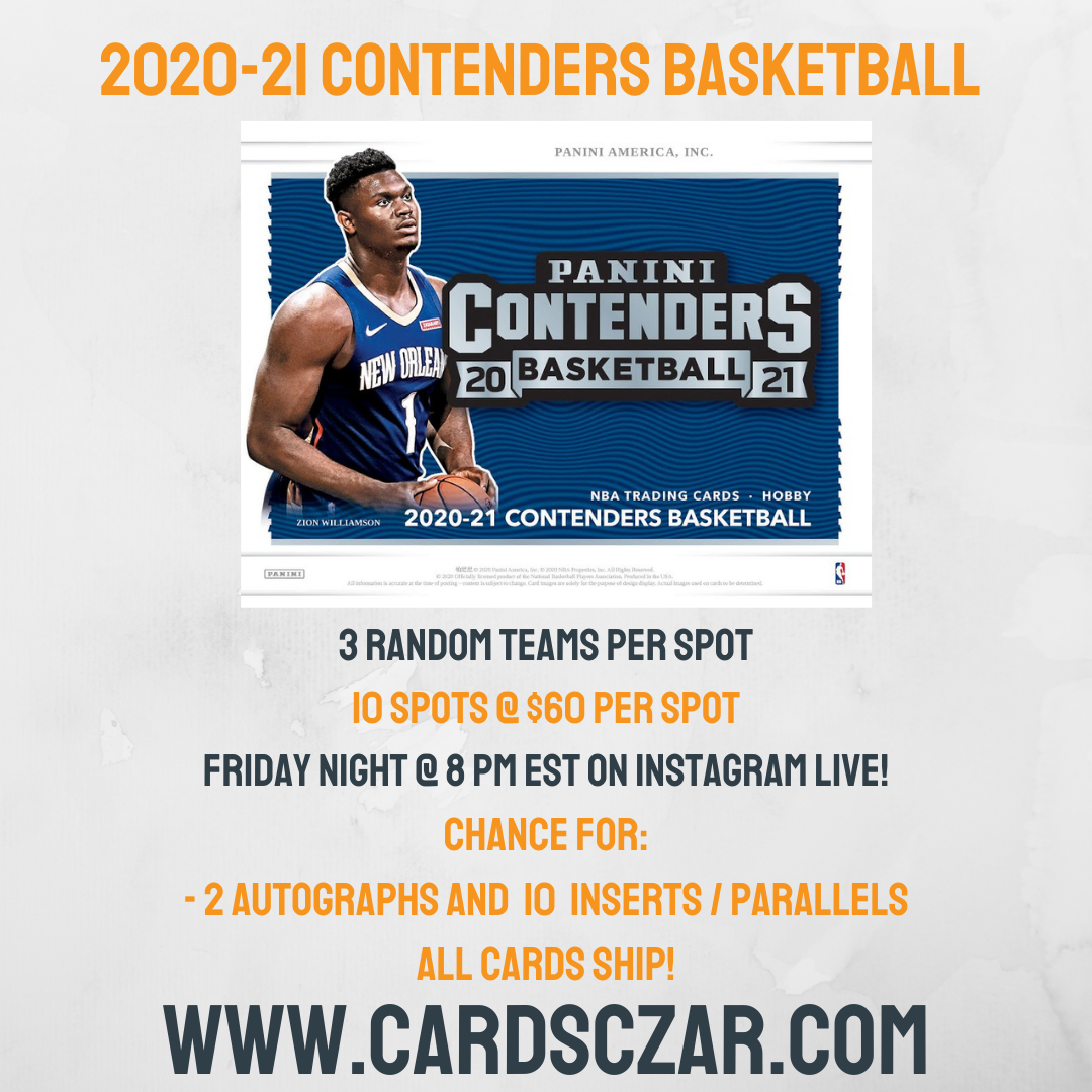 2020-21 Contenders Basketball 3 Random Team 1 Box Break 10 Spots @ $60 per Spot Via Instagram Live 2020-21 Contenders Basketball Chance for: - 2 AUTOGRAPHS - 2 PARALLELS - 8 INSERTS OR INSERT PARALLELS ALL CARDS SHIP! Dates and times may change.
