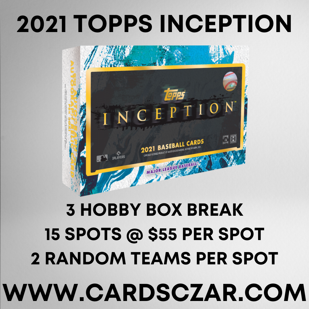 2021 Topps Inception Baseball 3 Hobby Box Break 15 Spots @ $55 per Spot 2 Random Teams Per Spot! Via Instagram Live 2021 Topps Inception Baseball 1 Pack Per Box/7 Cards Per Pack ALL CARDS SHIP! This break will include: 12 Base Cards, 6 Base Parallels and 3 Autographs/Autograph Relic Cards on Average Dates and... View Article