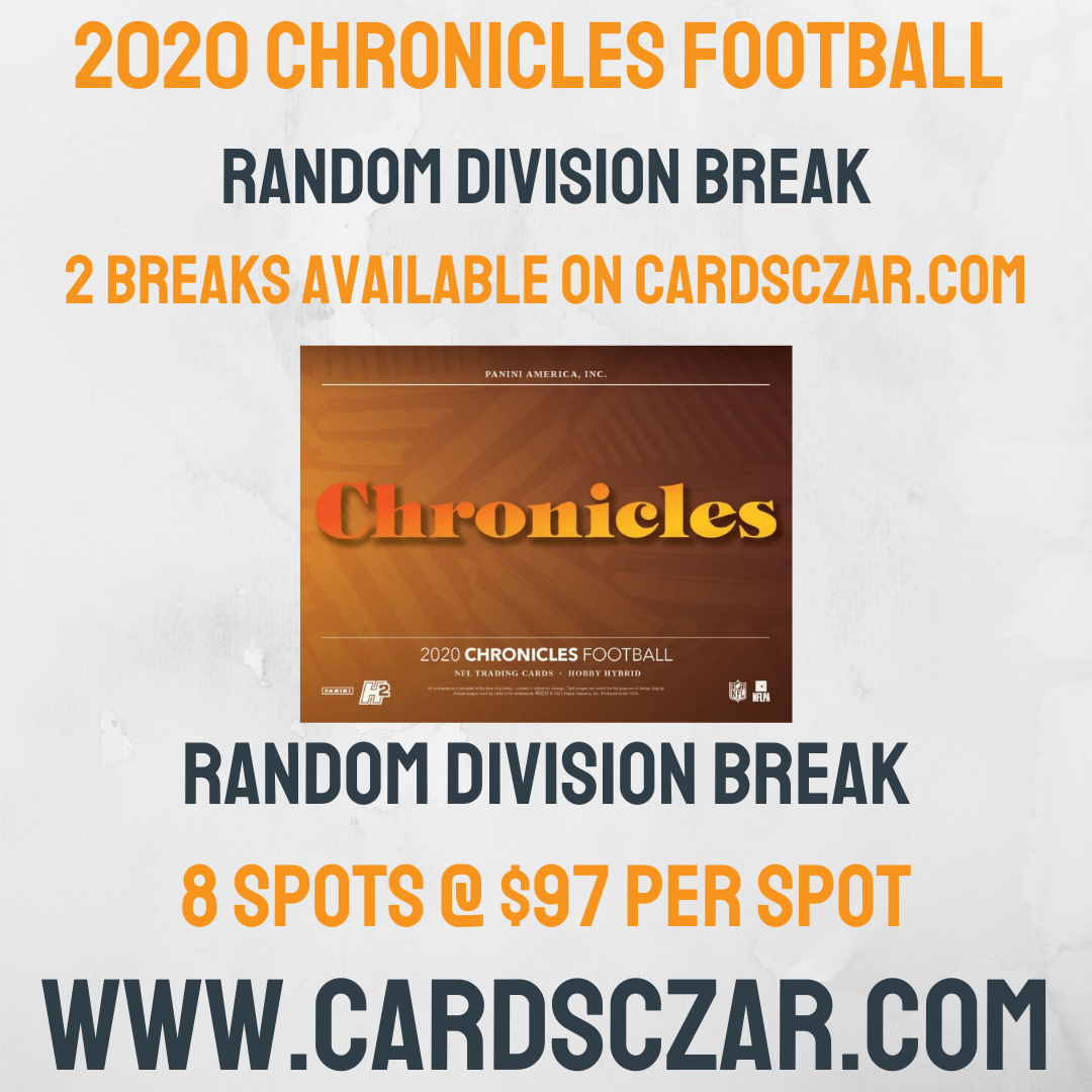 2020 Chronicles Football Random Division Break Box #1 1 Box Random Division Break 8 Spots @ $80 per Spot Via Instagram Live 2020 Chronicles Football ALL CARDS SHIP! Let's go! 2 Autographs, 1 Relic card and a whole TON of rookies! Chronicles has been on FIRE this year. Don't miss the chance to hit some... View Article