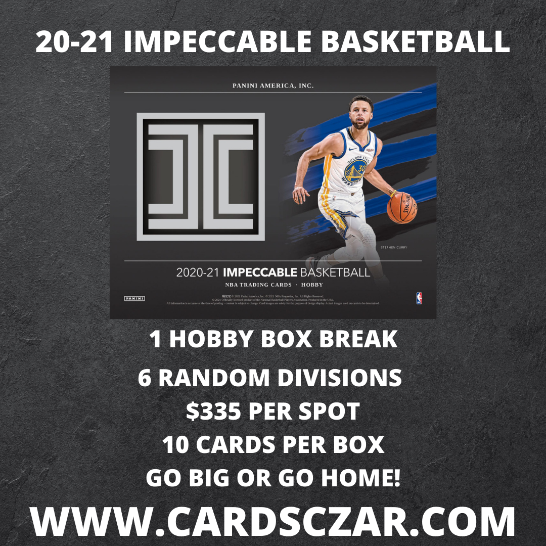 2020-21 Impeccable Basketball 6 Random Team 1 Box Break 6 Spots @ $335 per Spot Via Instagram Live 2020-21 Impeccable Basketball Chance for: - 5 ON CARD AUTOGRAPHS - 3 BASE OR BASE PARALLELS - 1 REAL SILVER INSERT, REAL GOLD INSERT or STAINLESS STAR (non auto) ALL CARDS SHIP! Dates and times may change.