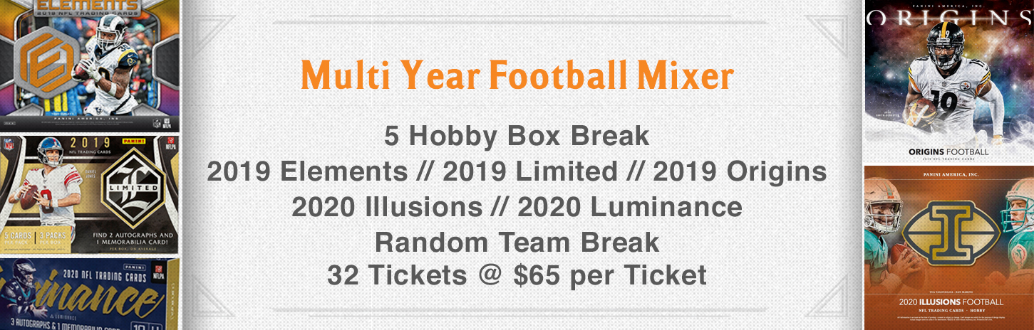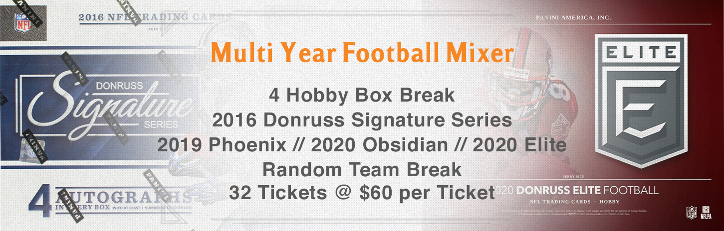Multi Year Football Mixer 4 Box Random Team Break 32 Spots @ $60 per Spot 5% discount on multiple spots using promo code MULTIBREAKS4 at Checkout Via Instagram Live 2016 Donruss Signature Series Chance for one of the following: 4 Autographs 2019 Phoenix Chance for one of the following: 2 Autographs 1 Memorabilia 12 Parallels... View Article