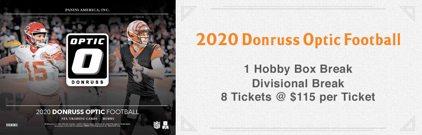 2020 Donruss Optic Football 1 Box Divisional Break 8 Spots @ $115 per Spot Via Instagram Live Chance for one of the following: 1 Autograph 14 Rookies 6 Rated rookies 10 Parallels 4 Inserts Per box on average Base Cards Ship 8 Random Divisions at $115 per spot 6 boxes available. We will break as... View Article