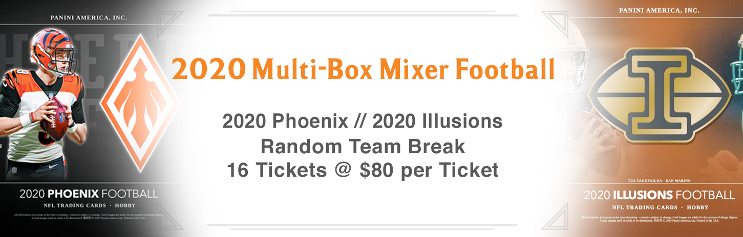 2020 Multi-Box Mixer Football 2 Box Tag Team Break 16 Spots @ $80 per Spot Via Instagram Live Chargers/Texans Bengals/Falcons Dolphins/Giants Eagles/Saints Chiefs/Titans Packers/Browns Vikings/Patriots Colts/Seahawks Jaguars/Panthers Washington/Cardinals Cowboys/Bears Lions/Jets Rams/Ravens Steelers/Bills Broncos/Raiders 49ers/Bucs 2020 Phoenix Football 2 Autographs 1 Memorabilia 12 Parallels 12 Rookies 9 Inserts All base will ship 2020 Illusions 3 Autographs... View Article
