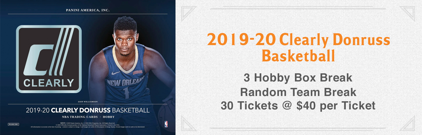2019-20 Clearly Donruss Basketball 3 Box Random Team Break 30 Spots @ $40 per Spot Via Instagram Live Guaranteed to Hit (on average): 9 Parallels 3 Inserts Chance for one of the following: Clearly Rated Rookie Autographs EXTREMELY Rare Holographic and Holographic Mosaic Parallels 30 Random Teams at $40 per spot 3 boxes available. ALL... View Article