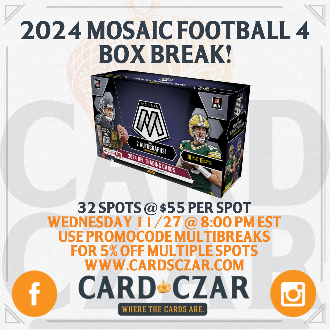 2024 Mosaic Football 4 Hobby Box Break The shiny football cards are coming and Mosaic is sure to please yet again this year. We have a TON coming, but decided to set aside 4 boxes for our standard RELEASE DAY BREAK! This break will be: 2024 Mosaic Football Hobby Box x 4 What's in the... View Article
