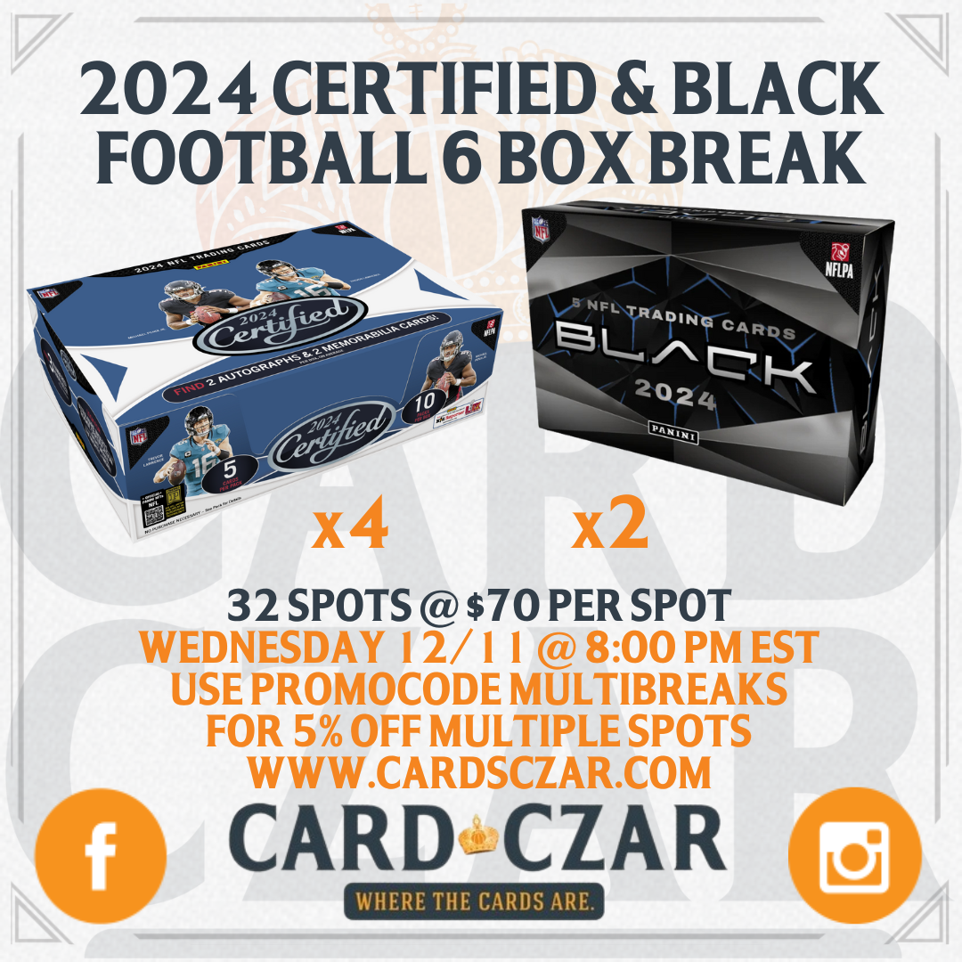 2024 Certified & Black Football 6 Hobby Box Break We couldn't break Certified on release day last week, but good news, we are mixing it in with the brand new Panini Black on Wednesday night and making an old fashioned mixer of NEW product! This break will be: 2024 Certified Football Hobby Box x 4... View Article