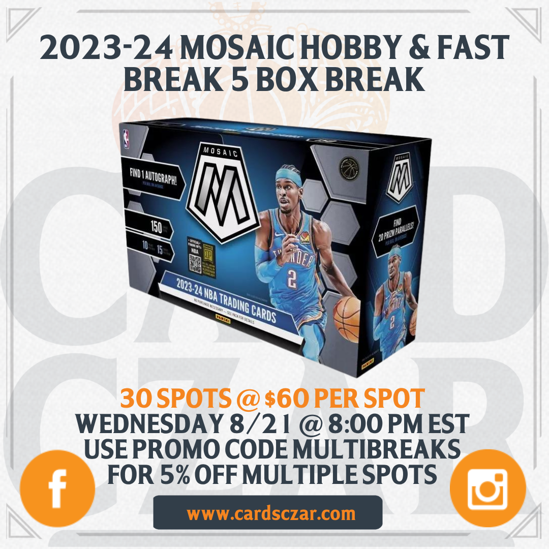 2023-24 Mosaic Hobby & Fast Break Basketball 5 Box Break Mosaic has been tough to get our hands on, but we are making sure we save enough for our Wednesday night BREAKS! This break will be: 2023-24 Mosaic Basketball Hobby x 2 2023-24 Mosaic Basketball Fast Break x 3 What's in the break? (On Average):... View Article
