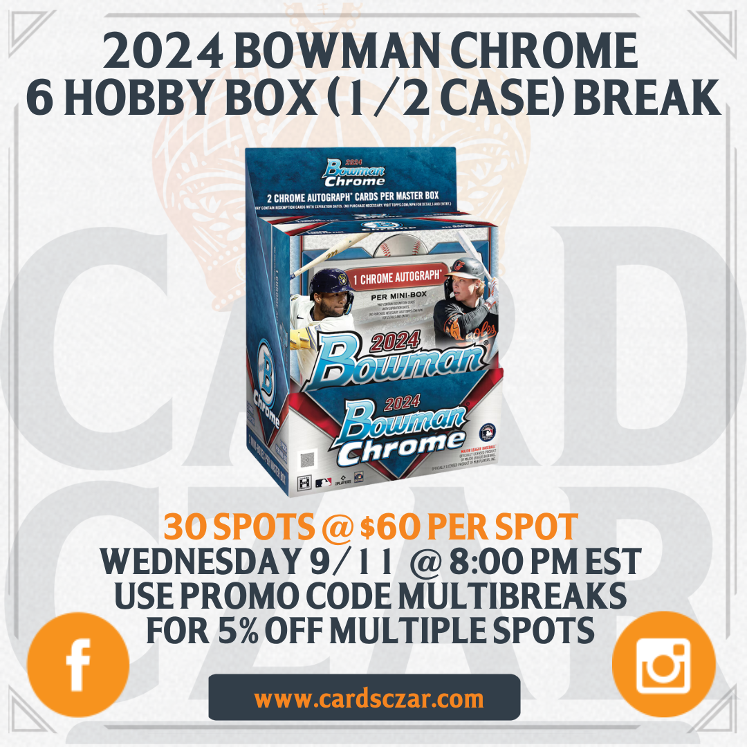 2024 Bowman Chrome Baseball 6 Hobby Box Half Case Break One of the most popular baseball releases of the year drops on Wednesday and Card Czar is loaded to the gills with it! BOWMAN CHROME is coming to the Czar channel! If we sell out of this break, we will have more releasing, so get... View Article
