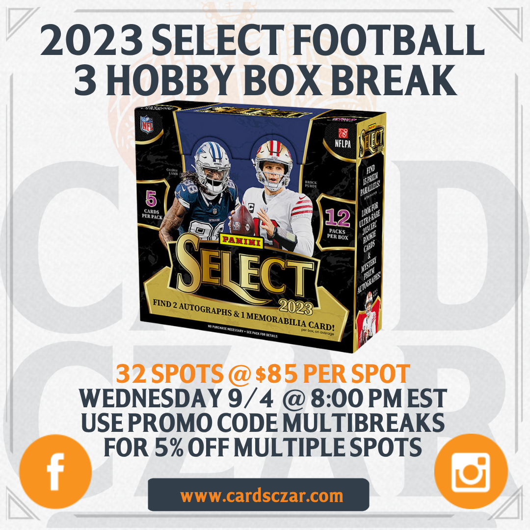 2023 Select Football 3 Hobby Box Break It's been a pretty hectic week, but don't fret, we still have 2023 Select Football left and we are ready BREAK that on Wednesday night! 3 boxes of Select, means 3 chances at beautiful autos, low numbered Prizms, memorabilia cards and case hits! This break will be: 2023... View Article