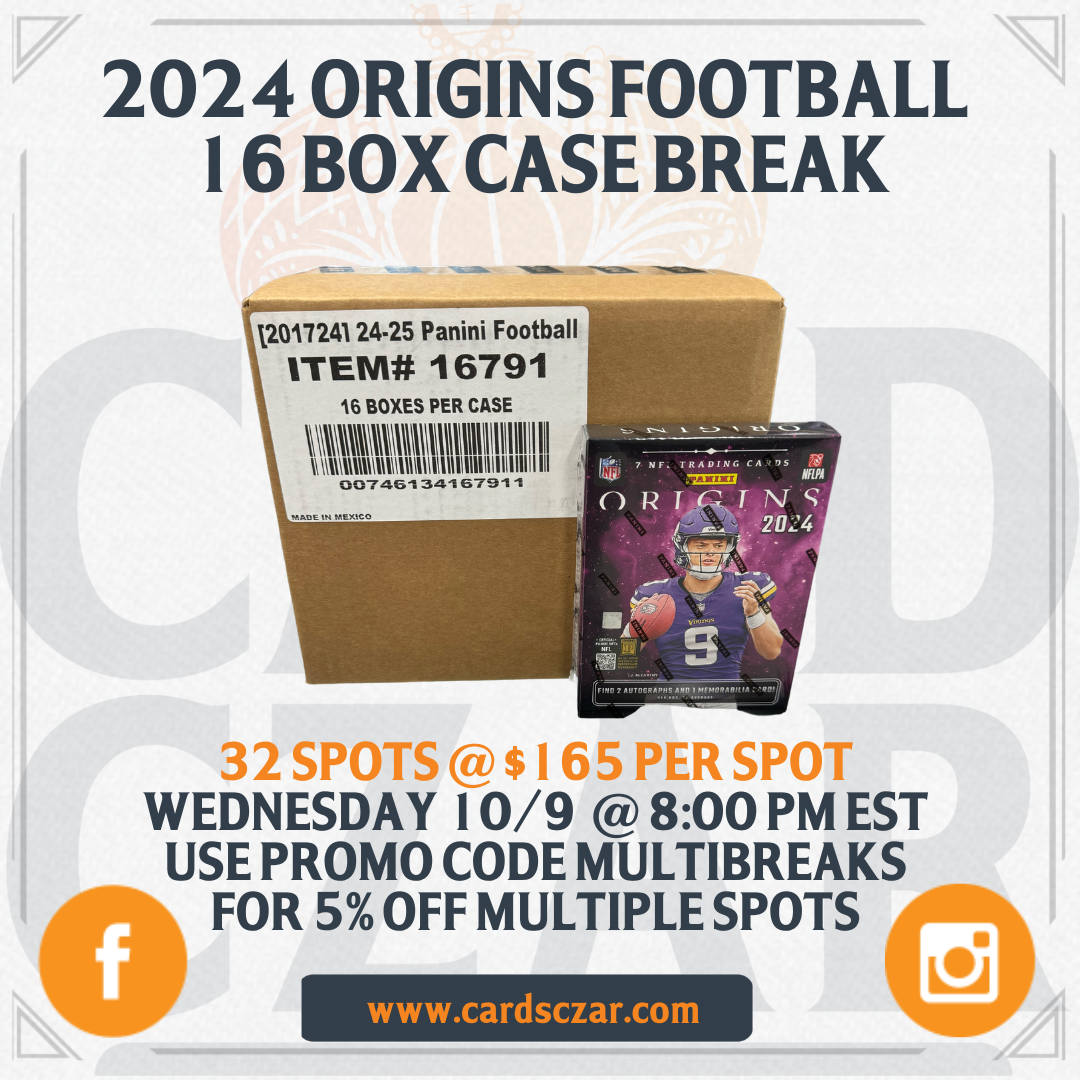 2024 Panini Origins Football 16 Box Case Break The last time we ripped a case of Origins it was 2018 and the hobby wasn't what it is today! Wish we held onto that case, but it was a fun rip! In 2024 we are going big time and offering up this CASE BREAK! 16 Boxes... View Article