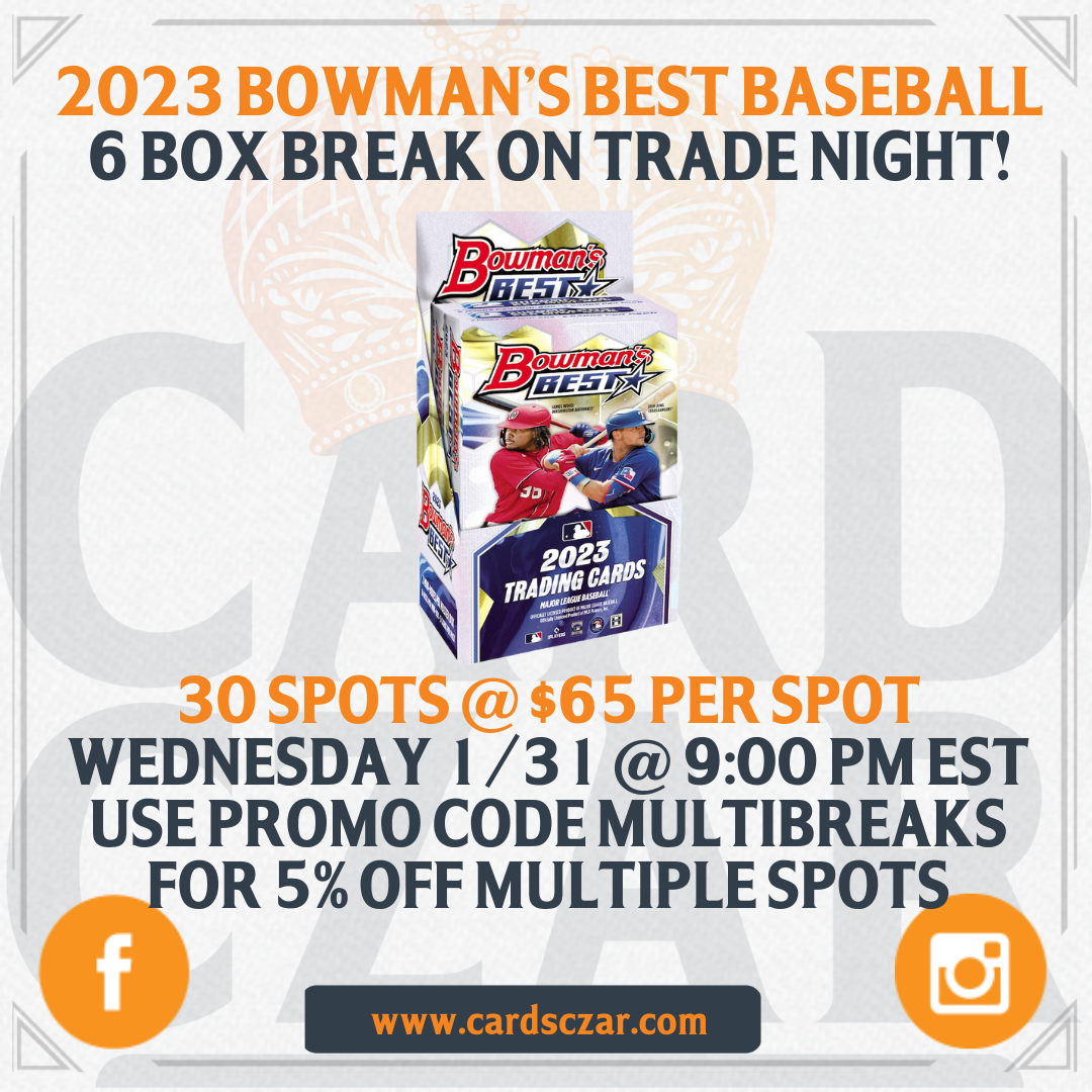 2023 Bowman's Best Baseball 6 Hobby Box Break On trade night...we BREAK! Let's get crazy folks! We are breaking a half a case of the super popular 2023 Bowman's Best, as we hope to hit on card autos of all the best rookies and prospects in the talented 2023 class! This break will be: 2023... View Article