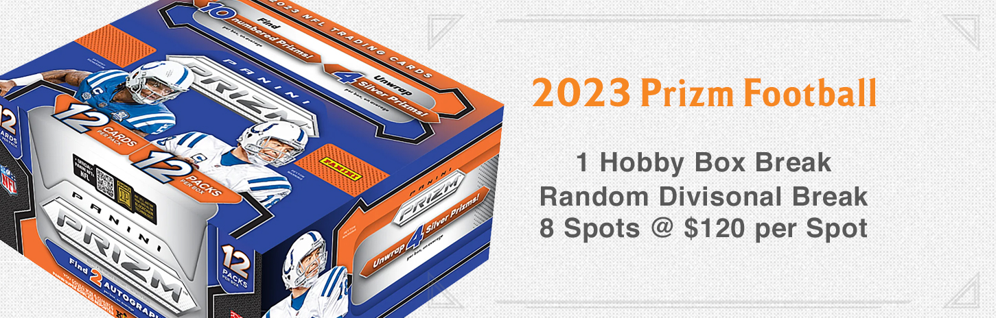 2023 Prizm Football Hobby Box Divisional Break #3 We all know what time it is. PRIZMMMM is here and Card Czar has plenty of boxes for your ripping and breaking pleasure. Wednesday night will surely be one to remember, as we plan on opening up MULTIPLE breaks! This break will be: 2023 Prizm Football Hobby... View Article